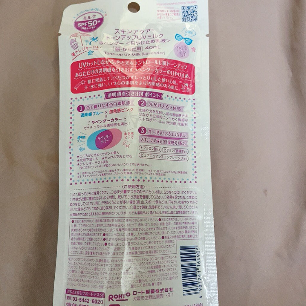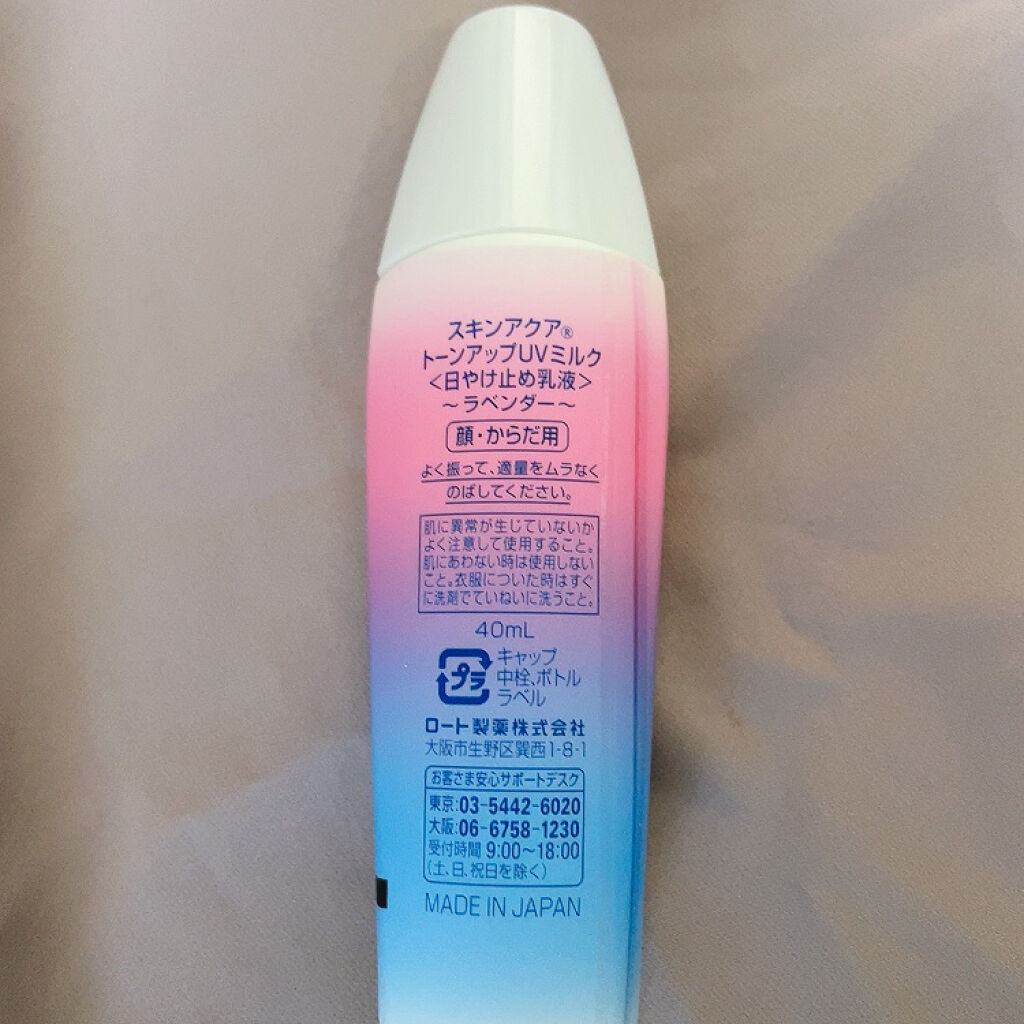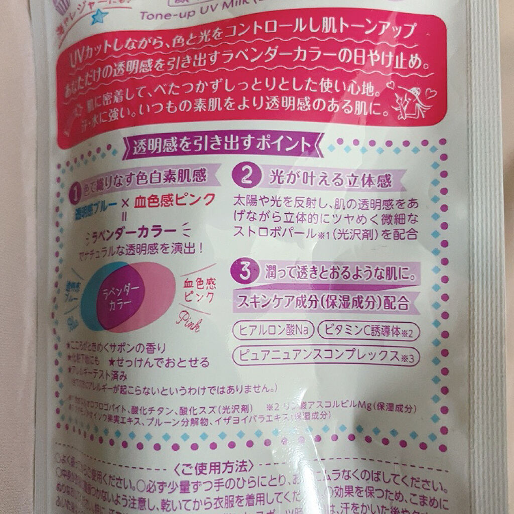 - 「スキンアクア トーンアップUVミルク」は、UVカットしながら、色と光をコントロールし、肌をトーンアップ。あなただけの透明感を引き出すラベンダーカラーの顔・からだ用日やけ止め。汗・水に強い強力密着ミルク。肌に密着して、べたつかずしっとりとした使い心地。日やけ止めを塗っているだけなのに、いつもの素肌をより透明感のある肌に。 透明感ブルー×血色感ピンク=ラベンダーカラーで、ナチュラルな透明感を演出!日光や光を反射し、肌の透明感をあげながら立体的にツヤめく微細なストロボパール※1配合。スキンケア成分(保湿成分)としてヒアルロン酸Na、ビタミンC誘導体※2、ピュアニュアンスコンプレックス※3配合。 SPF50+/PA++++。こころがときめくサボンの香り。化粧下地にも。石けんで落とせます。 パラベンフリー。鉱物油フリー。アレルギーテスト済み(全ての方にアレルギーが起こらないというわけではありません)。 ※1:合成フルオロフロゴバイト、酸化チタン、酸化スズ(光沢剤) ※2:リン酸アスコルビルMg(保湿成分) ※3:クダモノトケイソウ果実エキス、プルーン分解物、イザヨイバラエキス(保湿成分) 紫外線防止成分:紫外線吸収剤・紫外線散乱剤