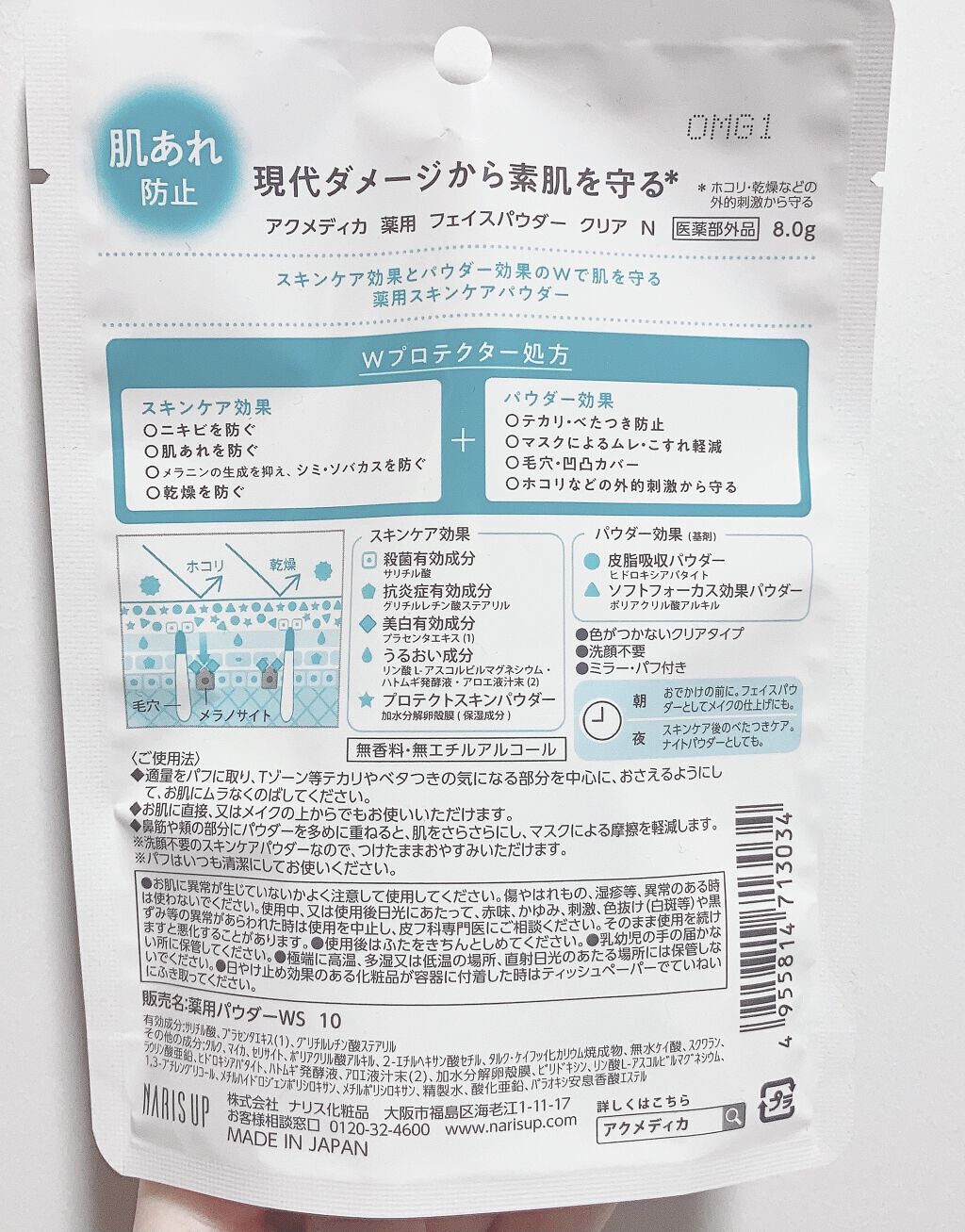 - 【医薬部外品】 マスクによるムレ・こすれ、ニキビetc... 『現代ダメージから素肌を守る』人気の薬用フェイスパウダー【アクメディカ】がリニューアル♪ 持ち運びに便利なミラー付きコンパクトになりました♪ 色がつかない『クリア』タイプです。 ●薬用【肌あれ・ニキビ予防】 ・殺菌有効成分:サリチル酸 ・抗炎症有効成分:グリチルリチン酸ステアリル ●薬用【美白】 ・メラニンの生成を抑え、シミ・ソバカスを防ぐ:プラセンタエキス ●皮脂吸収パウダーでテカリ・べたつきを防ぎ、さらすべ素肌が続きます。 ●ソフトフォーカス効果で、気になる毛穴・凹凸をふんわりカバー。 ●パウダー効果で、マスクによるムレ・こすれや、ホコリ・乾燥などの外的刺激から肌を守ります。 ●美肌をサポートする保湿成分もたっぷり。 ●色がつかない透明タイプ。 洗顔不要でスキンケア後のべたつきケアや、ナイトパウダーとしても。 ●どこでもスキンケアできるミラー&パフ付きコンパクト になりました。 (販売名:薬用パウダーWS10)