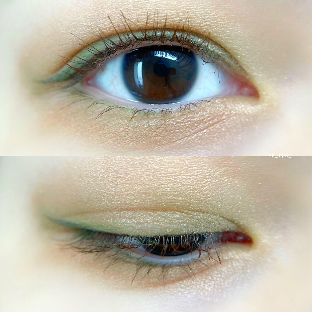 大好きな#CATKIN #長相思シリーズ 9色アイシャドウパレット C08 モランディ ブルーの締色をつかって、目尻を引き締めてくすみパープルのような隣のカラーはまつ毛のキワに、上下とも使用してクール感をアップさせました。 涙袋を立体感をだしてます。 何度使ってもお気に入りのCATKIN!!