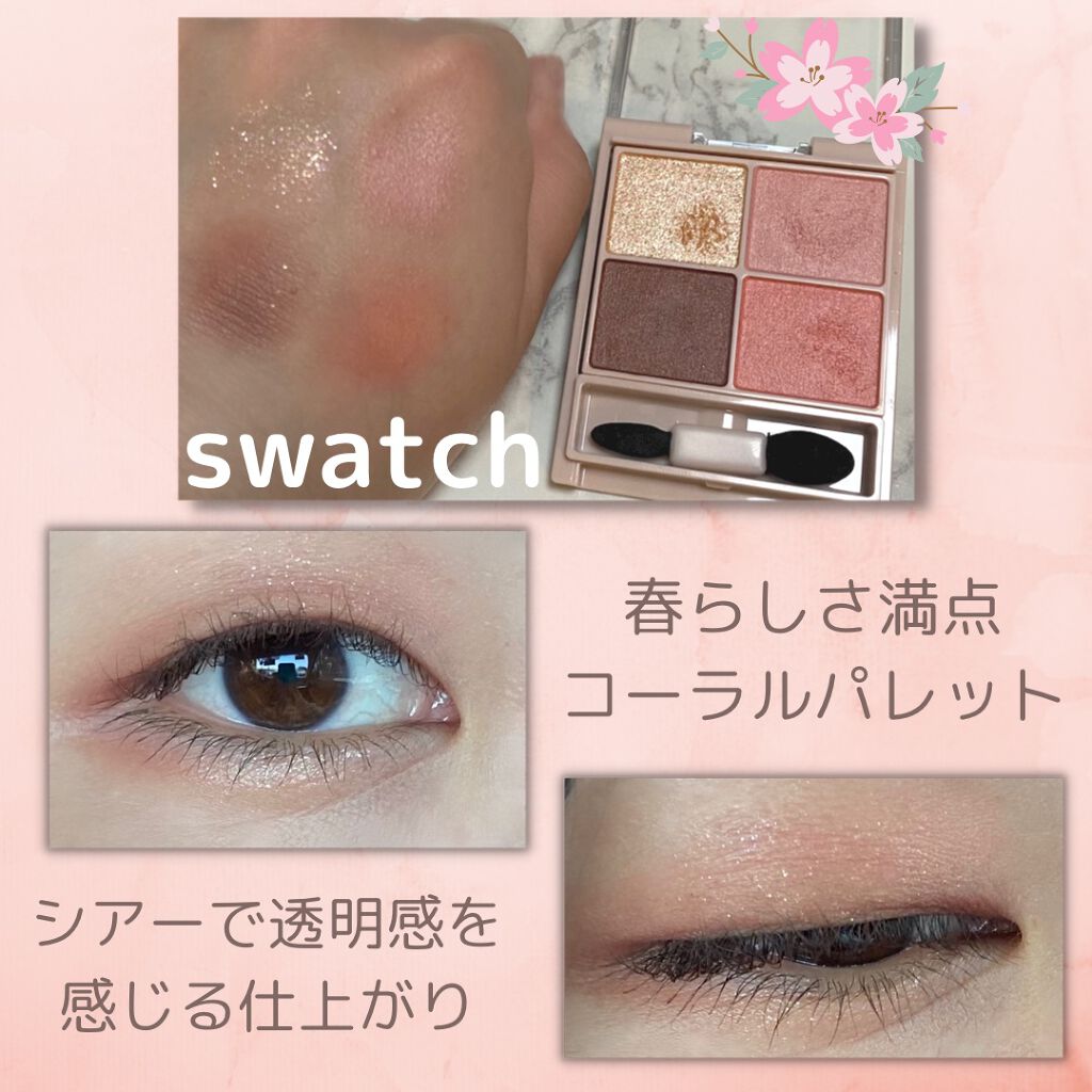 - シルキースフレアイズの姉妹品♡ 肌に溶け込むような透けマットシャドウ 透け感のある柔らかい仕上がりになるマット3色と、透け発色の繊細ラメ1色のパレットシャドウ♡ 完全マットアイや、ラメ×マットアイなど、メイクのパターンを楽しみましょう!