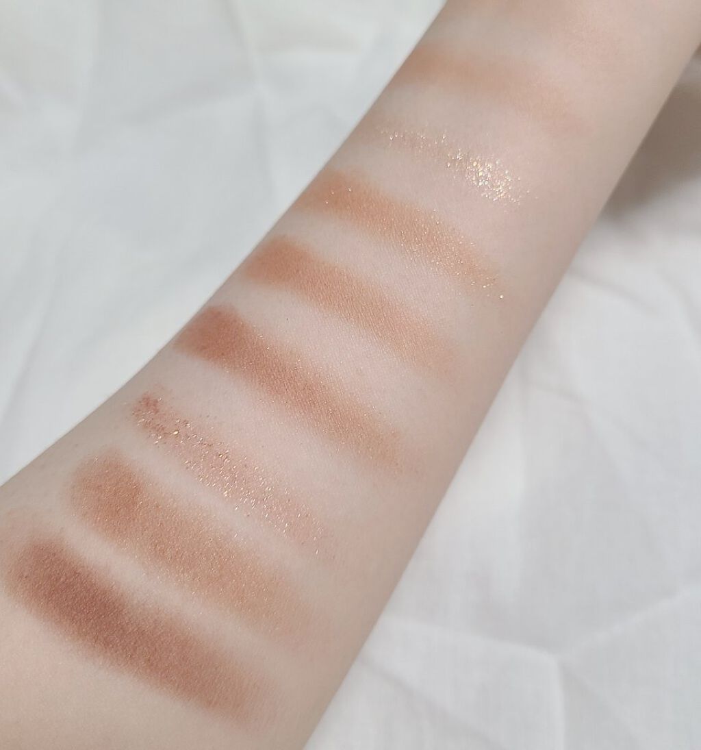 どちらも粉飛びすることはないけど、わりと軽い粉質なので目元に塗るときはアイシャドウベースを塗った方がいいかも? マルチパレットだからこれ1つでアイシャドウ、チーク、ハイライト完成します☺️ 白みピンクはわりと発色柔らかめなのでチークに使えそう!粒々の集合体はわりと濡れ感のあるラメでお気に入りになりました✨ 全体的に色味が少ない印象なので、儚げなメイクに合いそうですね😃💕 本当はヌーディーピンクが本命だったのですが、実際届いたら、ついでに買ったこちらのアッシュピンクの方が気に入ってしまいました笑 色味も捨て色がないし、何よりラメが大優勝でした! ヌーディーピンクの粒々と同じ位置にあるおラメさん。。。可愛すぎます。。。 ヌーディーピンクのラメと同じく濡れ感のあるテクスチャーです! パレットだとシルバーっぽいラメだと感じるのですが、実際腕に出してみるとベースが少しくすんだピンク味のある淡いブラウンなんです! 動画のスウォッチを見ていただくとわかると思うのですが、密着度高めでラメの輝き方も綺麗でした😭