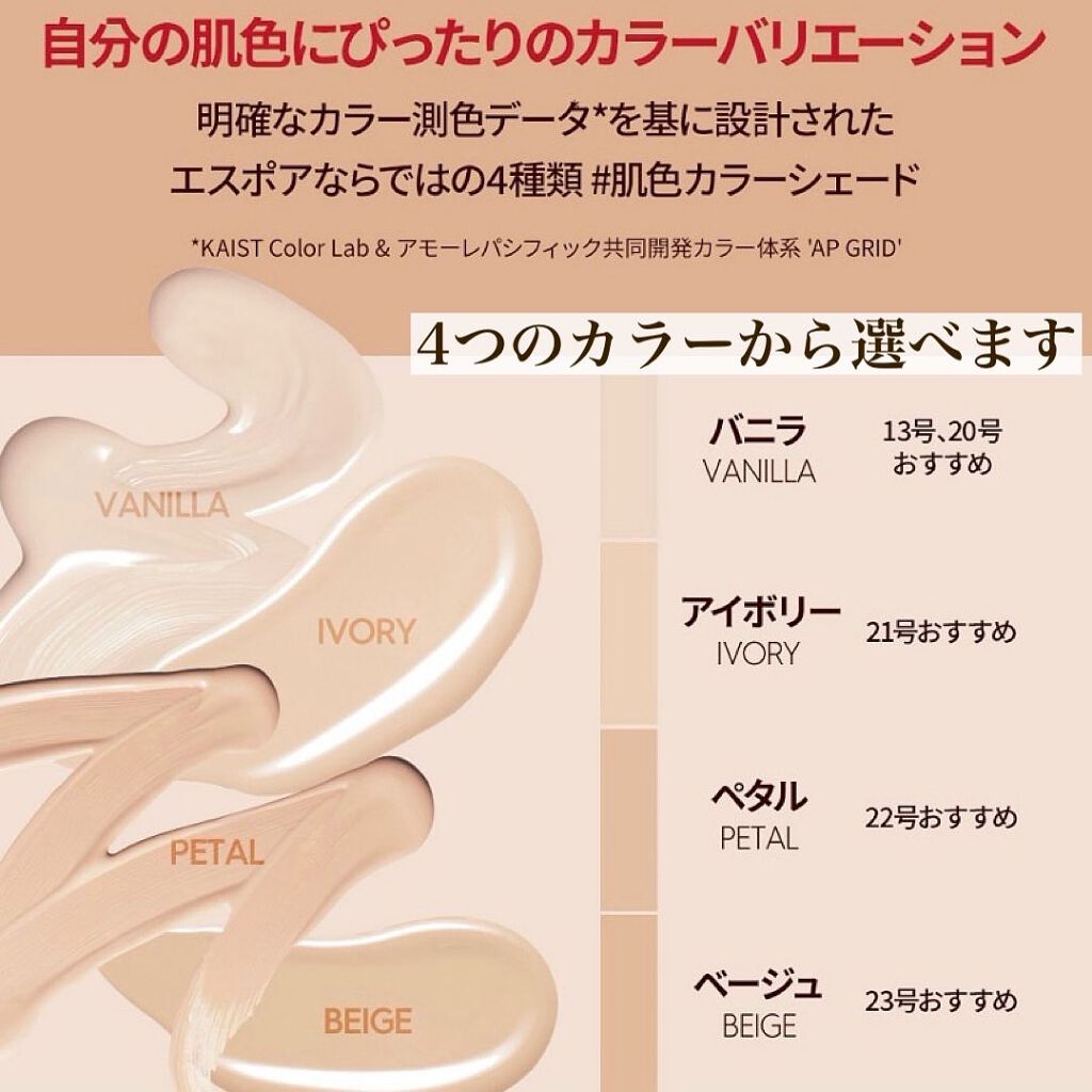 エスポアの25号はどうだ!?espoirビーベルベットカバークッション25号タンピーチスキンフィッティングベースオールニューSPF50PA++++リニューアル前の23号を持っていて下地と合わせて気に入っているけどやっぱり白くて気を使いました。...