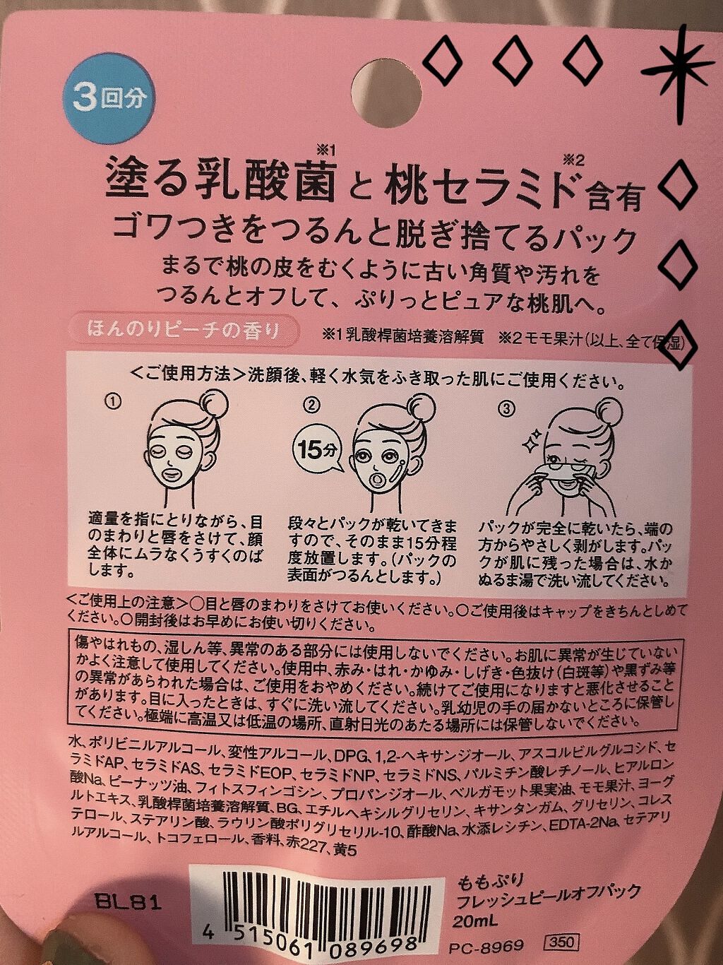 - <ももぷり フレッシュピールオフパック> 水、ポリビニルアルコール、変性アルコール、DPG、1,2-ヘキサンジオール、アスコルビルグルコシド、セラミドAP、セラミドAS、セラミドEOP、セラミドNP、セラミドNS、パルミチン酸レチノール、ヒアルロン酸Na、ピーナッツ油、フィトスフィンゴシン、プロパンジオール、ベルガモット果実油、モモ果汁、ヨーグルトエキス、乳酸桿菌培養溶解質、BG、エチルヘキシルグリセリン、キサンタンガム、グリセリン、コレステロール、ステアリン酸、ラウリン酸ポリグリセリル-10、水添レシチン、EDTA-2Na、セテアリルアルコール、トコフェロール、香料、赤227、黄5