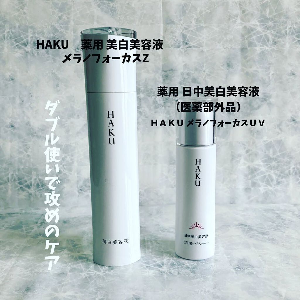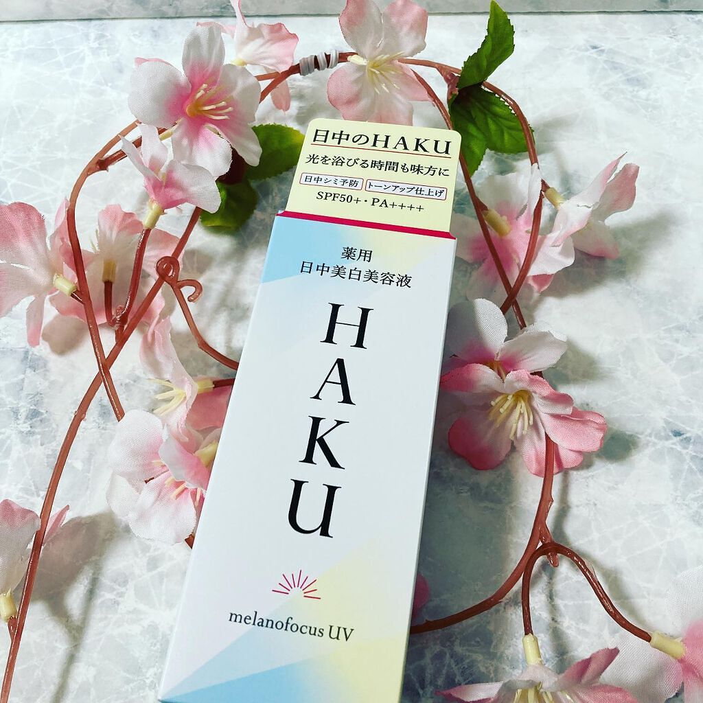- 販売名「メラノフォーカスUV」 SPF50+・PA++++ 日中のHAKU。光を浴びる時間も味方に、日中だからできる美白ケアのアプローチ。 シミ予防研究の先端技術を搭載し、日中ならではの美白ケアを可能にした、薬用日中美白美容液です。光を浴びる時間も味方にして、明るく透明感のある肌に導きます。 ○2種の美白有効成分を肌の奥まで届け効かせる。 ○日中の肌環境に着目し、Wデイエフェクターを配合。うるおいを与え届ける。 〇ファインレッドパールαが効果的に光を放ち、シミや色ムラを目立たせない。トーンアップ効果で、明るく透明感のある仕上がり。 〇みずみずしい美容液がスーッとなじむ。化粧下地としても使える。 ○無香料・アレルギーテスト済み・ニキビのもとになりにくい処方。 (全てのかたにアレルギーが起きない、ニキビができないというわけではありません)。