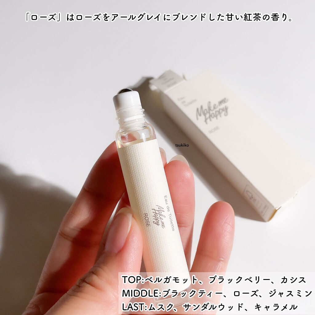 つける量を調整しやすい、ロールオンタイプのオードトワレです。 持ち運びにも便利なサイズ! 正直、「これはちょっと…」っと思うような、きつすぎる香りはなく(個人の意見です笑)、ふわっと香る良い香りがたくさんありました。 メイクミーハッピー オードトワレ WHITE ~白い花束をイメージした柔らかい香り~ 💬柔らかいフローラルの香りで、上品です