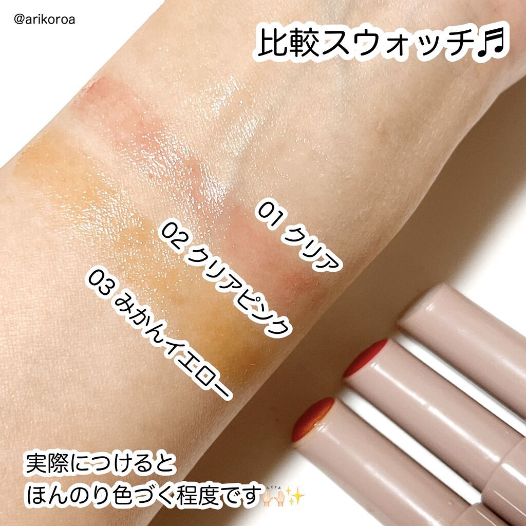 - <01 クリア> 水添ポリイソブテン、ワセリン、オリーブ果実油、ジエチルヘキサン酸ネオペンチルグリコール、スクロース、ポリエチレン、リンゴ酸ジイソステアリル、ジフェニルシロキシフェニルトリメチコン、ジメチルシリル化シリカ、キャンデリラロウ炭化水素、水添ヒマシ油、セスキイソステアリン酸ソルビタン、メントキシプロパンジオール、BG、水、ソメイヨシノ葉エキス、カミツレ花エキス <02 クリアピンク> 水添ポリイソブテン、ワセリン、オリーブ果実油、ジエチルヘキサン酸ネオペンチルグリコール、スクロース、ポリエチレン、リンゴ酸ジイソステアリル、ジフェニルシロキシフェニルトリメチコン、ジメチルシリル化シリカ、キャンデリラロウ炭化水素、水添ヒマシ油、セスキイソステアリン酸ソルビタン、メントキシプロパンジオール、トコフェロール、水酸化Al、BG、水、ソメイヨシノ葉エキス、カミツレ花エキス、酸化チタン、黄4、赤202、酸化鉄 <03 みかんイエロー> 水添ポリイソブテン、ワセリン、オリーブ果実油、ジエチルヘキサン酸ネオペンチルグリコール、スクロース、ポリエチレン、リンゴ酸ジイソステアリル、ジフェニルシロキシフェニルトリメチコン、ジメチルシリル化シリカ、キャンデリラロウ炭化水素、水添ヒマシ油、セスキイソステアリン酸ソルビタン、メントキシプロパンジオール、トコフェロール、BG、水、ソメイヨシノ葉エキス、カミツレ花エキス、黄4、赤202、酸化鉄