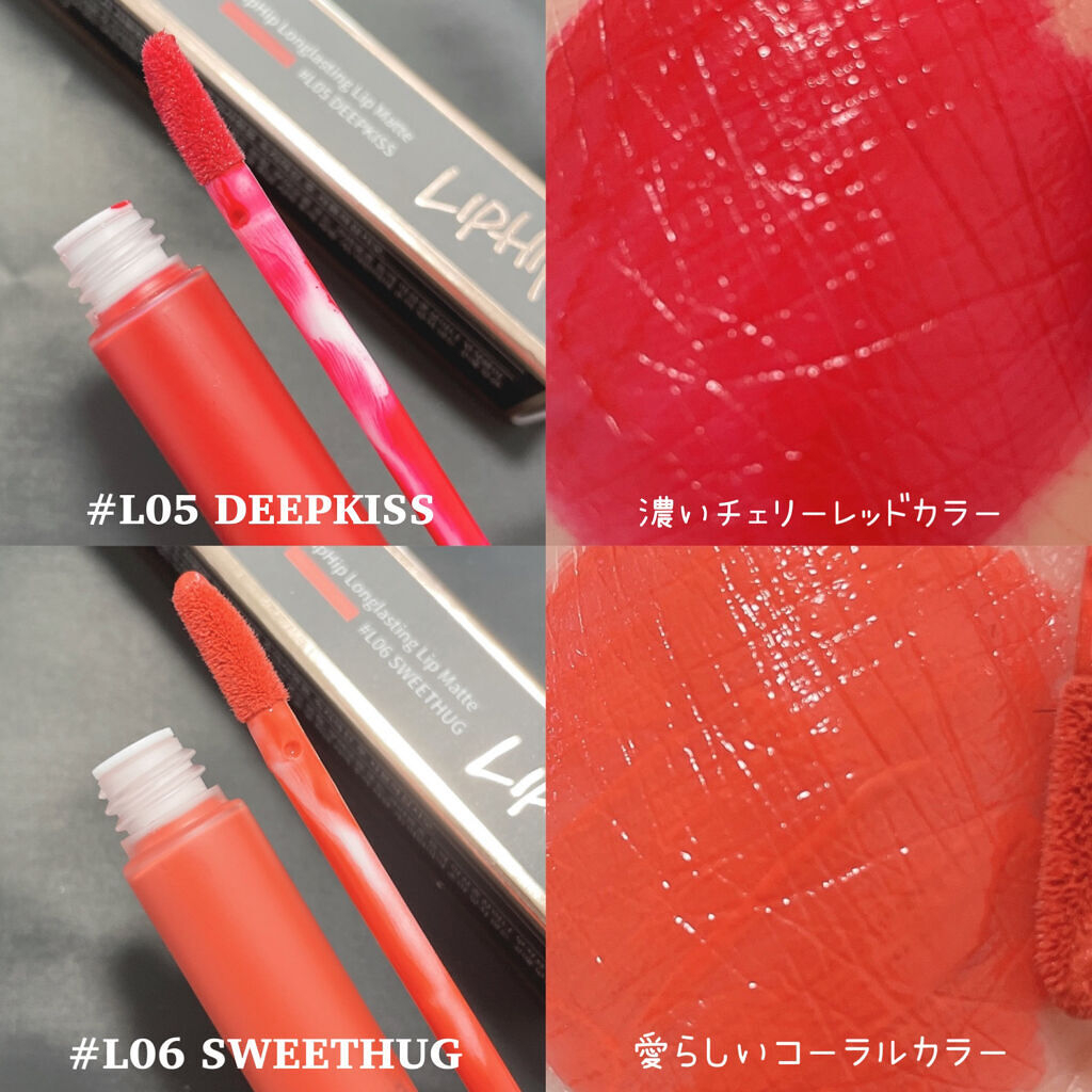 【ブランド】LIPHIP【モデル】ロングラスティングマットリップティント【カラー】#09BACKHUG【質感】セミマット【色味】レッド何回が画像をみてもどういる色がわからななく、とりあえず一番濃いのを買ってみるっと、で買ってみたら思ったより明...