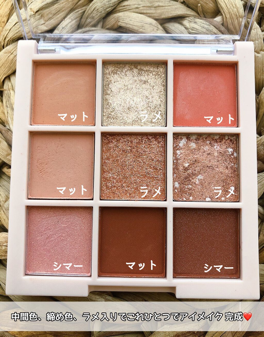 - ひとつでマット・シアーマット・パール・グリッター・ラメの多彩な質感とカラーバリエーションが楽しめる9色アイシャドウパレット。微細粒子で肌にぴったりフィットして馴染み、発色の良さが続きます。