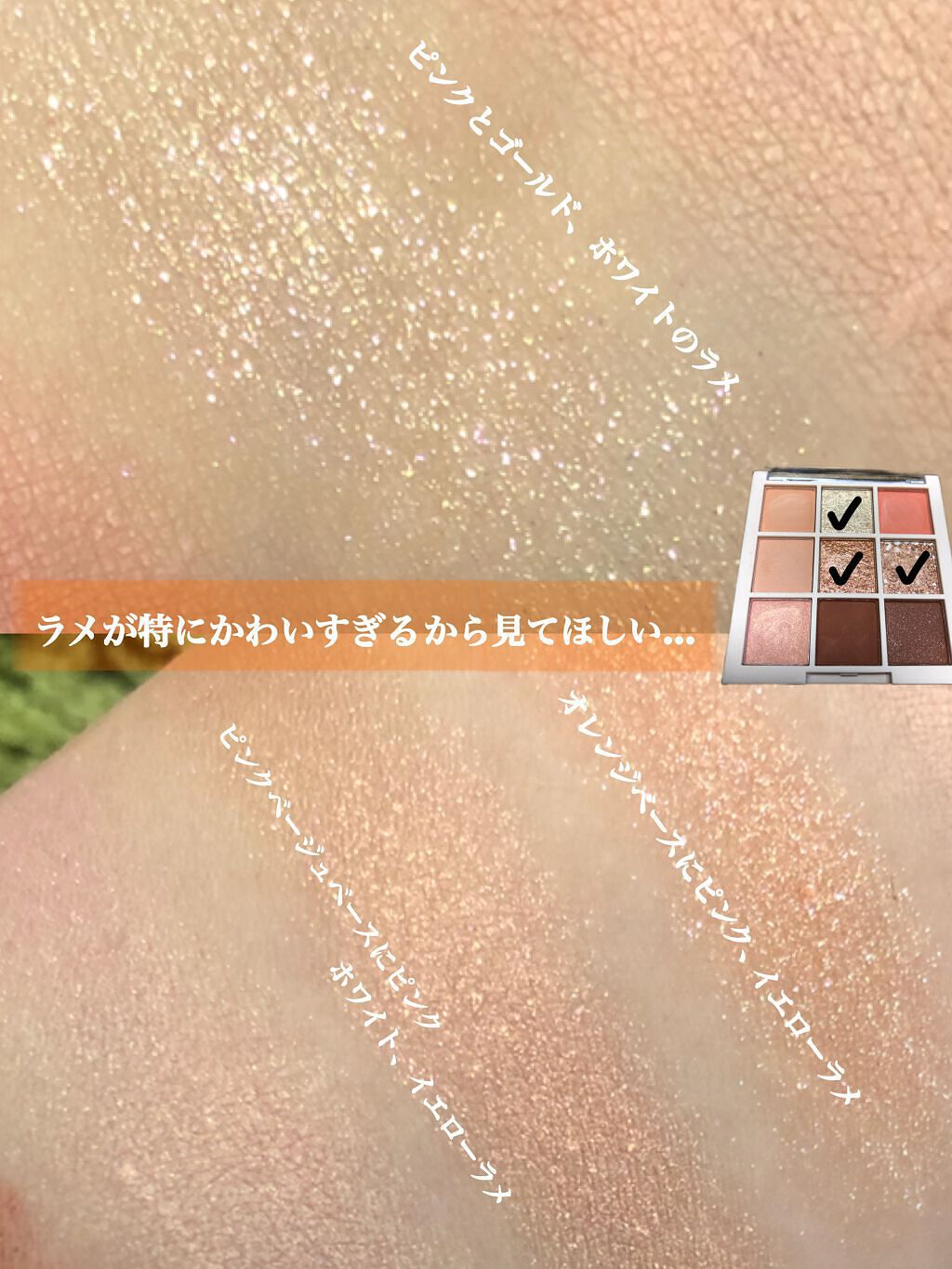 なのにアイシャドウのもちも良くなってるんだとか👏✨✨ 終売のカラーもあるのが残念ですが、淡い色やベースに使いやすいカラーが出て個人的には嬉しい😊 さてこのピンクゴールド、名前の通り優しいピンクベースにゴールドのパールがちらちら光ってかわいいんです!!ラメとも言えるくらい輝度が高い!❤️ 単色でも重ねて塗ればちゃんと発色して全然いけるし、ベースとして使うと奥行き出るしですごく良いです❤️ 他の色も気になる…夏らしい色が多い気がした🍉🐠
