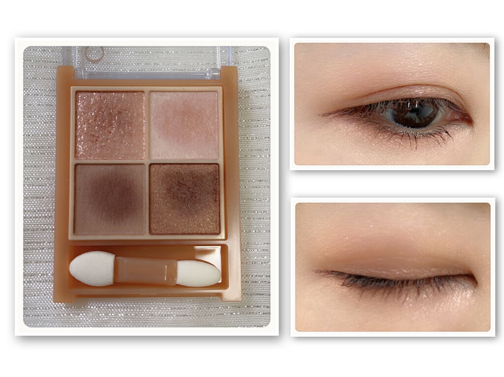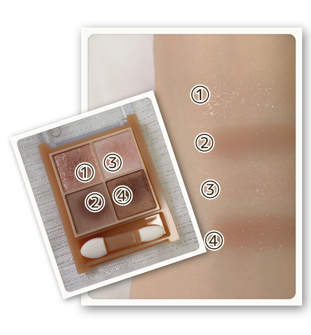 - ラメ・パール・マット3質感の4色アイシャドウ。 肌馴染みの良いベージュを基調としたカラー。ラメ・パール・マットの3質感を重ねて、自然にまぶたを強調し奥行のある大きな目元へ。 しっとり溶け込むような柔らかなパウダーなので、スルスル伸びてまぶたにピタッと密着。保湿成分(スクワラン・ホホバ種子油)配合。