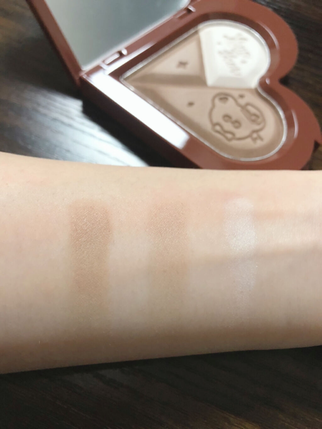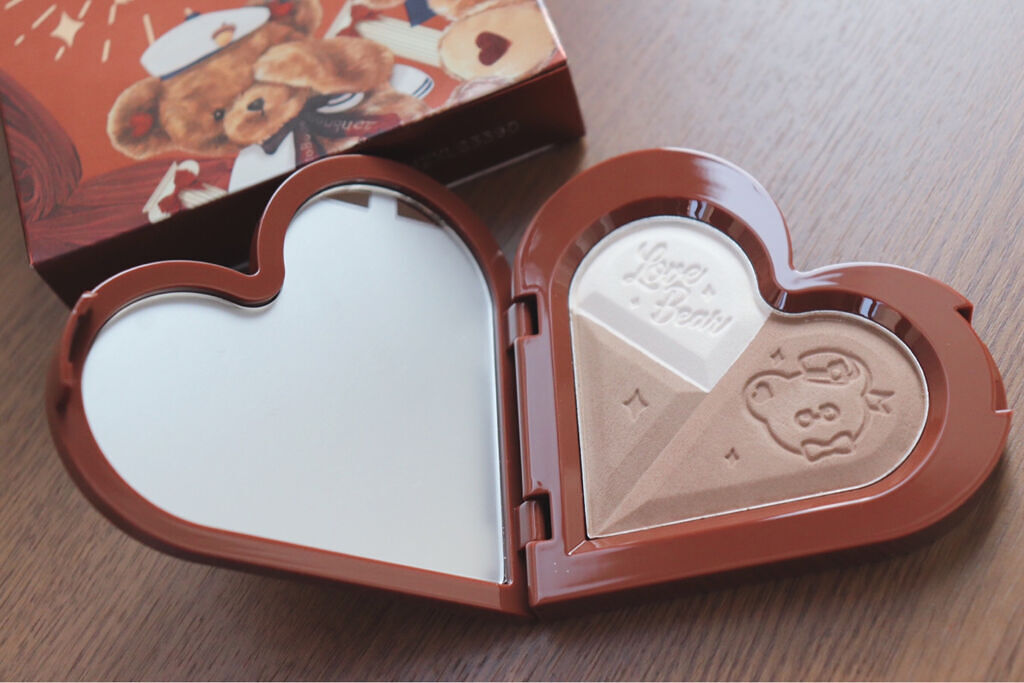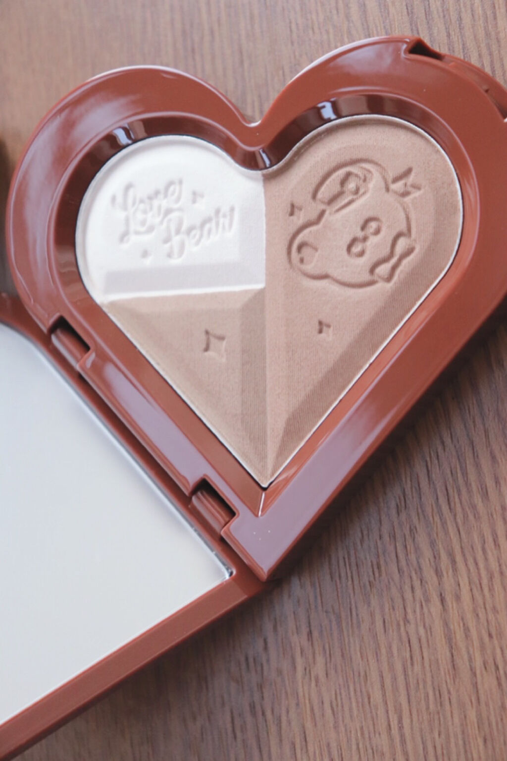 - しっとりパウダーで肌になじむ色味、濃淡シェードで理想的なフェイスライン! テディベアとチョコレートをモチーフにデザインされたハートの形のケースにハイライトとシェーディングがセットされたパレットです。