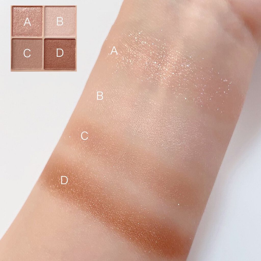 - ラメ・パール・マット3質感の4色アイシャドウ。 肌馴染みの良いベージュを基調としたカラー。ラメ・パール・マットの3質感を重ねて、自然にまぶたを強調し奥行のある大きな目元へ。 しっとり溶け込むような柔らかなパウダーなので、スルスル伸びてまぶたにピタッと密着。保湿成分(スクワラン・ホホバ種子油)配合。