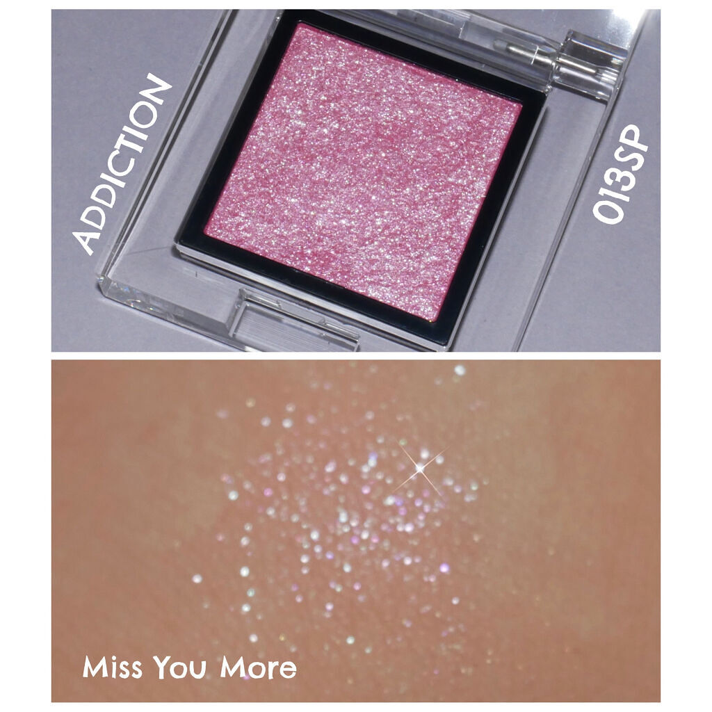 ADDICTIONザアイシャドウスパークル013SPMissYouMore015SPGleamyPondピンクとピーチ?色のアイシャドウ画像の通り、ラメがキラキラというよりギラギラ寄り。シルバーラメが輝くミスユーモアは塗ると意外と薄付き。単色...