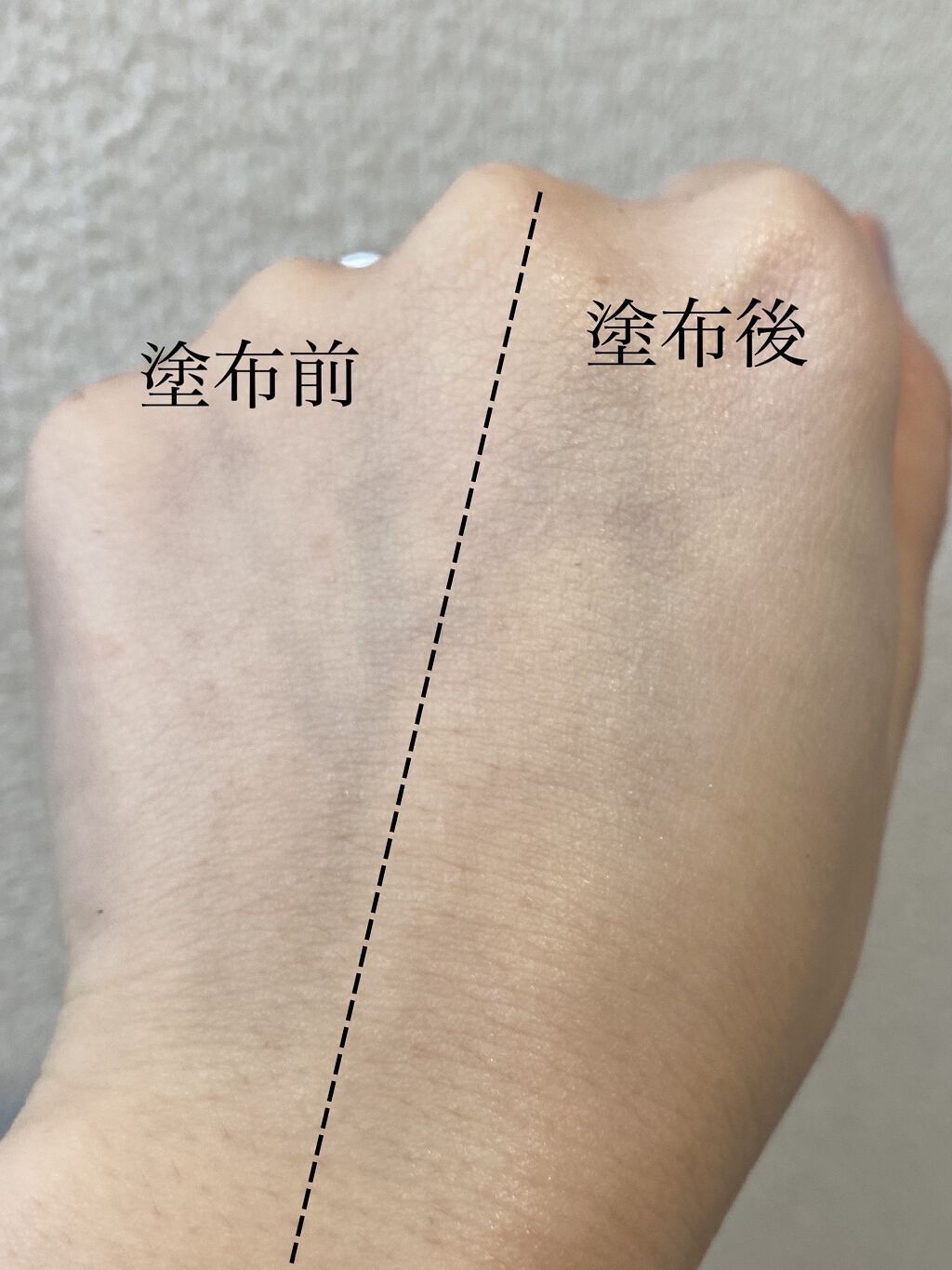 トーンアップするか否かの確認が漏れていて、無色透明のつもりで購入。開封時にパッケージを見てトーンアップやん!?!?となりました。しかしトーンアップと言っても艶で明るく見える程度の仕上がりで好みでした。 無色透明の方がベースメイク前に仕込むのに使いやすく、そのまま首やボディも塗れちゃうので手軽なんですよね。 塗りたては少しべたつくものの、時間が経つとベタつきは感じずしっとりとした触り心地に。