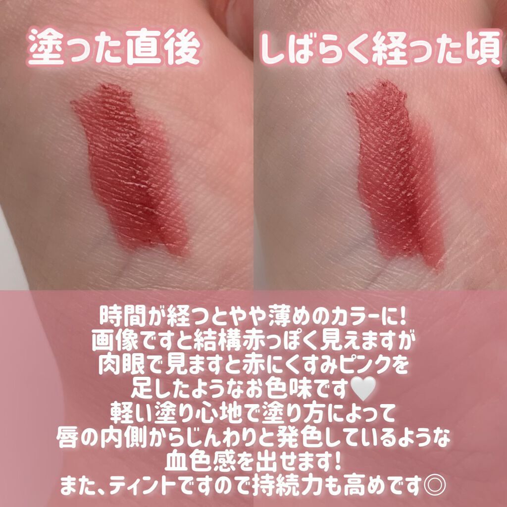 | 口紅・グロス・リップライナーランキング第42位 | 乾燥しにくく、艶感をキープしてくれて、ティント特有の色持ちも良く、ぷるっとしたジューシーな唇に仕上がります | 詳細を見る | |