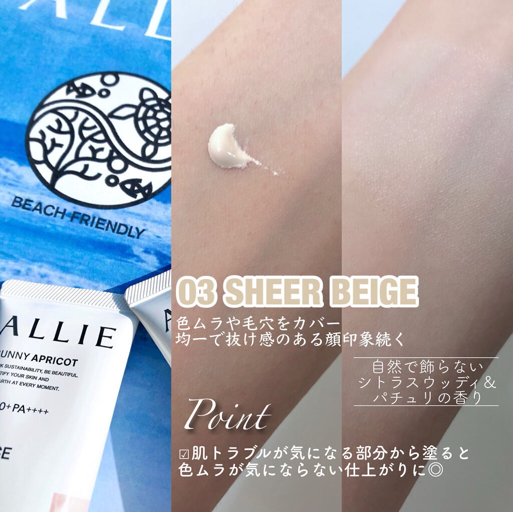 - 世界を想う 美しさつづく*1 日やけ止め おでかけも、マスクを外す機会も増える毎日に。 一部の国・地域・ビーチの規制に配慮した設計のビーチフレンドリー処方。 これ 1 本で、UV カット&顔色補整効果でクマ・くすみ・色ムラまでカバー! テカりにくく、くずれにくいノーファンデ UV*2 【ENNUI PURPLE】 くすみや毛穴をカバー 儚げな透明感のある顔印象続く 澄んだ気分を誘う 紫陽花しずく&セージの香り 【SUNNY APRICOT】 クマや毛穴をカバー いきいきとした血色感のある顔印象つづく 思わず出かけたくなる アプリコット&金木犀の香り 【SHERR BEIGE】 色ムラや毛穴をカバー 均一で抜け感のある顔印象つづく 自然で飾らない シトラスウッディ&パチュリの香り ●一部の国・地域・ビーチの規制に配慮した設計の「ビーチフレンドリー処方」 ●SPF50+・PA++++ ●汗・水 こすれに強く落ちにくい フリクションプルーフ・スーパーウォータープルーフ ●ベタつきにくい感触がつづく ●テカりにくくキレイな肌仕上がりがつづく ●環境に配慮した素材を使用したパッケージ採用 ●美容液成分(保湿)ヒアルロン酸Na配合 ●顔用 ●普段のメイククレンジングで落とせる ●マスク・タオル等につきにくい ●化粧下地効果 *1 スキンケア効果またはメイクアップ効果による肌仕上がりのこと *2 ファンデーション未使用時でも、自然なベースメイクが仕上がる日やけ止めのこと *3 チリ・ほこり・PM2.5・花粉等すべての微粒子汚れの付着を防ぐわけではありません 01:ENNUI PURPLE パープル 02:SUNNY APRICOT アプリコットピンク 03:SHEER BEIGE ミルキーベージュ
