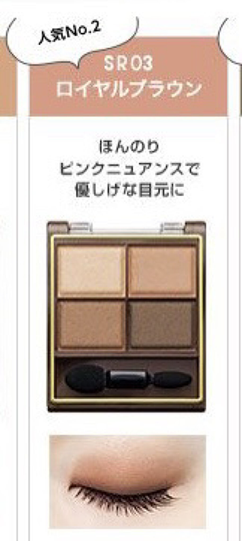 - 【ポイント】 1.失敗しらずのブラウンベースの4色パレット!簡単にグラデーションを実現。 2.しっとりリッチな質感!するする伸びて粉飛びもなく目元の乾燥も防ぎます。 3.上品な輝きの繊維パール+金パールを贅沢に配合。ギラつかない大人のツヤを演出。 <SR01'23・SR03'23・SR06'23・SR11'23(限定デザイン)> 実力派グラデアイシャドウからデジタルアートをあしらった限定デザイン登場。 しっとりリッチな密着感。肌のなじみの良い実力派グラデアイシャドウ。