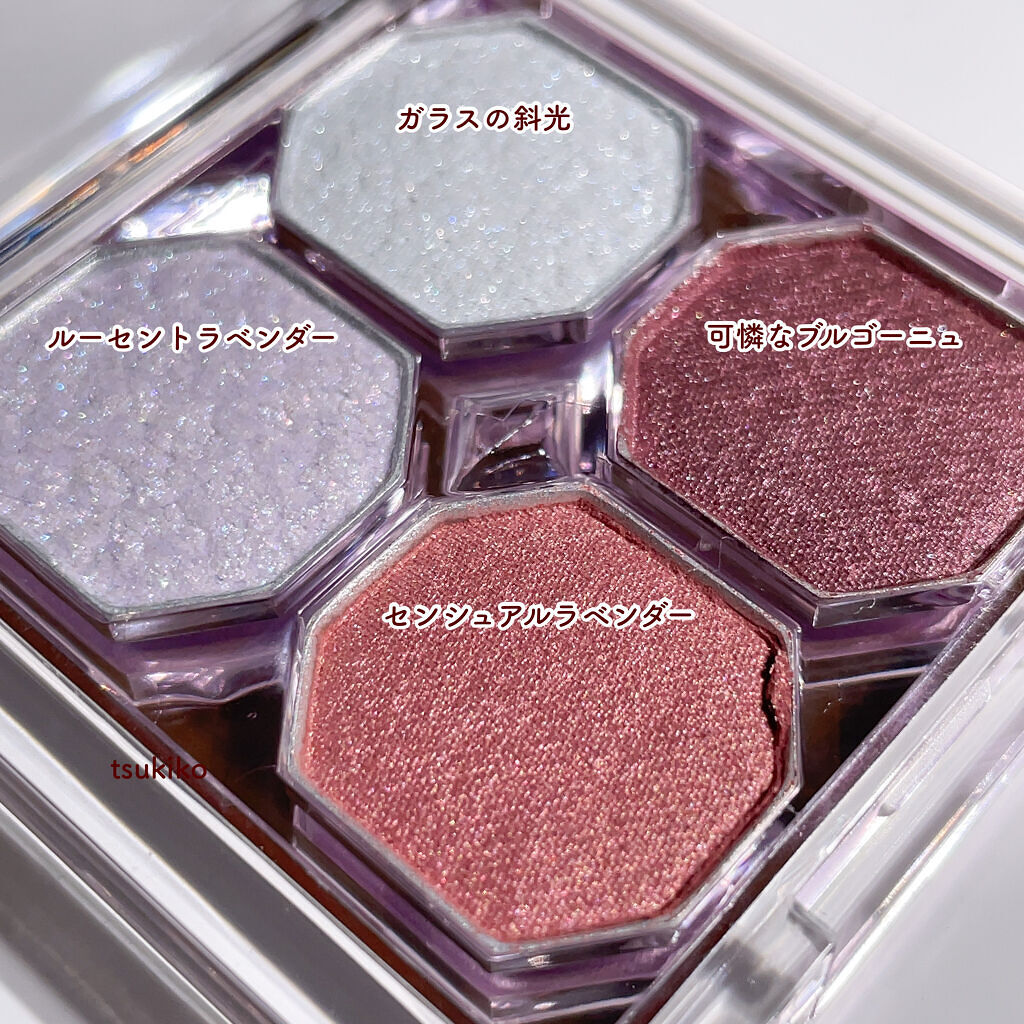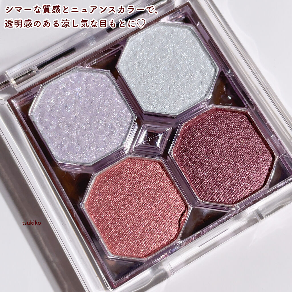 - 4色のアイシャドウを重ねるだけで理想のグラデーションが手軽に完成。深みを与えるマットや上品な艶めきをプラスするシマー、華やかなラメを組み合わせれば、こなれ感とナチュラルさを持ち合わせた目元に。シャンデリアのように華やかなグリッターやラメをのせて、毎日のメイクをもっとスペシャルに!