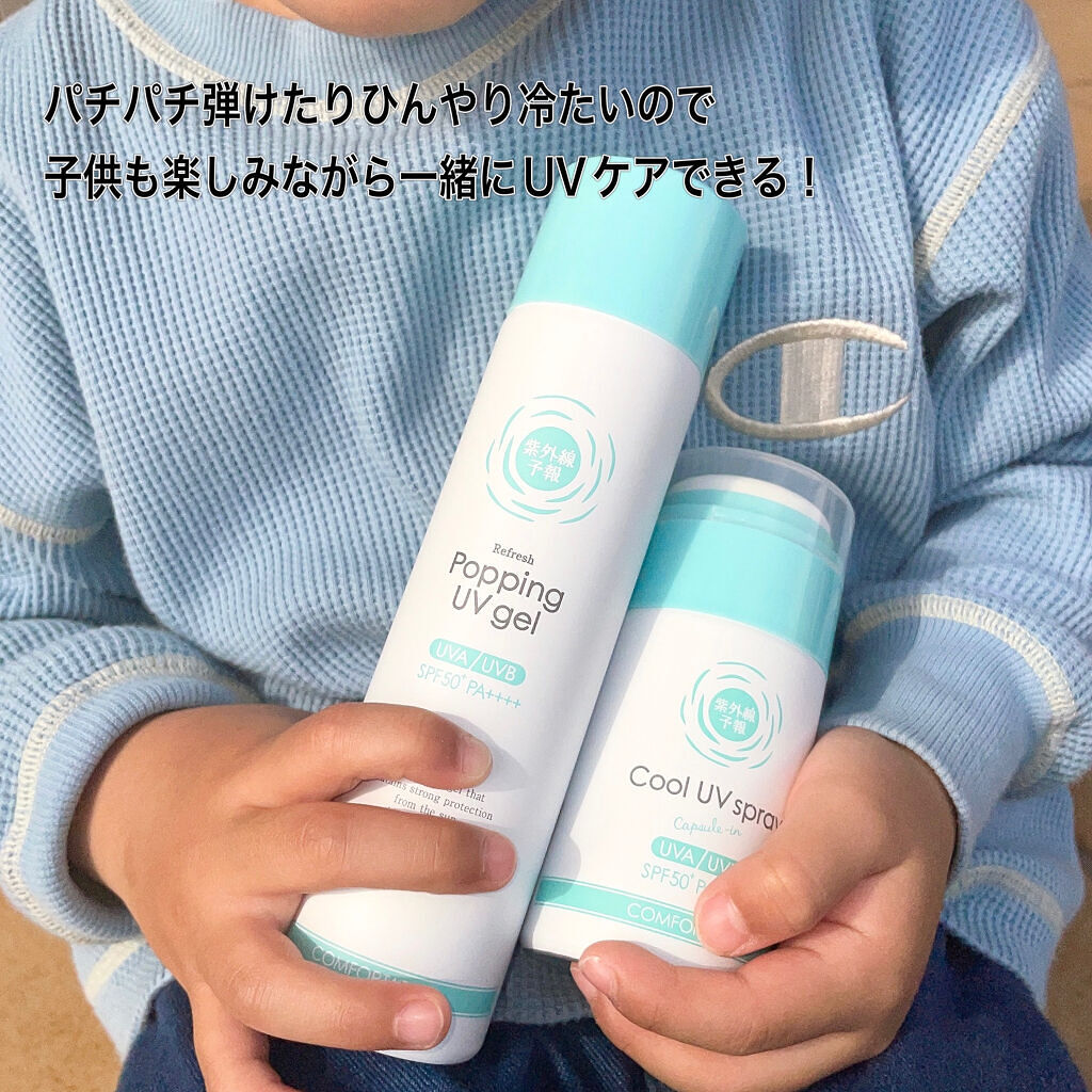 紫外線だけでなく暑さから逃れたい日が多かった印象です💦 毎日UVケアはするものの汗ですぐ流れてしまう… スプレーして出た泡を体に塗り広げると、パチパチ音を立てて肌をひんやりリフレッシュできます✨ 肌に優しい処方で石けんで落とせ、1歳から使用できます!! 家族みんなで使えるところも推せますね🩵