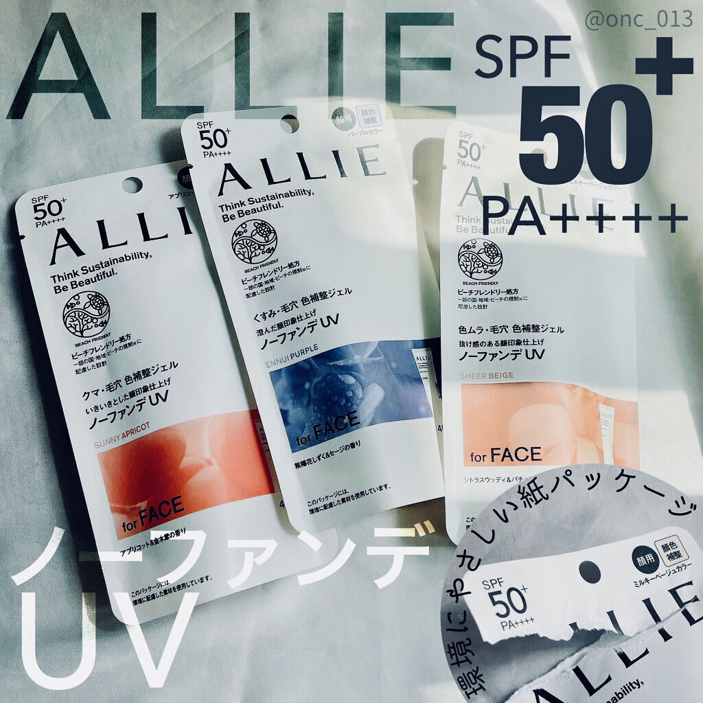 - 世界を想う 美しさつづく*1 日やけ止め おでかけも、マスクを外す機会も増える毎日に。 一部の国・地域・ビーチの規制に配慮した設計のビーチフレンドリー処方。 これ 1 本で、UV カット&顔色補整効果でクマ・くすみ・色ムラまでカバー! テカりにくく、くずれにくいノーファンデ UV*2 【ENNUI PURPLE】 くすみや毛穴をカバー 儚げな透明感のある顔印象続く 澄んだ気分を誘う 紫陽花しずく&セージの香り 【SUNNY APRICOT】 クマや毛穴をカバー いきいきとした血色感のある顔印象つづく 思わず出かけたくなる アプリコット&金木犀の香り 【SHERR BEIGE】 色ムラや毛穴をカバー 均一で抜け感のある顔印象つづく 自然で飾らない シトラスウッディ&パチュリの香り ●一部の国・地域・ビーチの規制に配慮した設計の「ビーチフレンドリー処方」 ●SPF50+・PA++++ ●汗・水 こすれに強く落ちにくい フリクションプルーフ・スーパーウォータープルーフ ●ベタつきにくい感触がつづく ●テカりにくくキレイな肌仕上がりがつづく ●環境に配慮した素材を使用したパッケージ採用 ●美容液成分(保湿)ヒアルロン酸Na配合 ●顔用 ●普段のメイククレンジングで落とせる ●マスク・タオル等につきにくい ●化粧下地効果 *1 スキンケア効果またはメイクアップ効果による肌仕上がりのこと *2 ファンデーション未使用時でも、自然なベースメイクが仕上がる日やけ止めのこと *3 チリ・ほこり・PM2.5・花粉等すべての微粒子汚れの付着を防ぐわけではありません 01:ENNUI PURPLE パープル 02:SUNNY APRICOT アプリコットピンク 03:SHEER BEIGE ミルキーベージュ