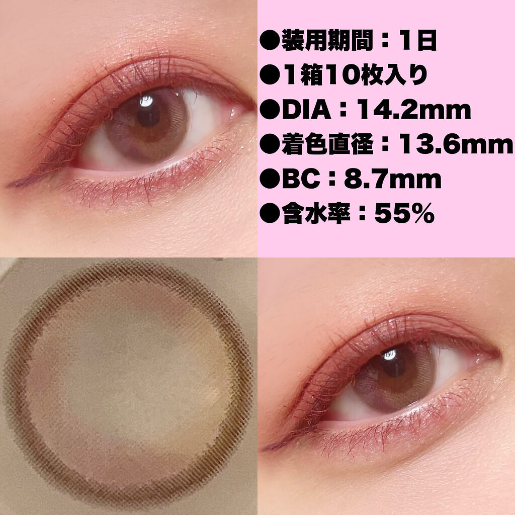 カラー・デザインがほんっっとにかわいかったよ!♡ 着色直径が13.2mmなの!だから、14.2mmだけど、少し小さく(ナチュラルに)感じるかな🤔! 明るめハイライトがポイント!!立体感が出て可愛いの!🥹 ナチュラルに瞳を大きくしてくれてキュンっとしたおめめに見せてくれる👀🤍