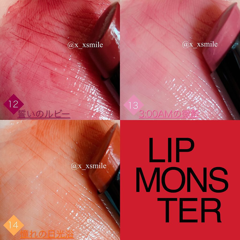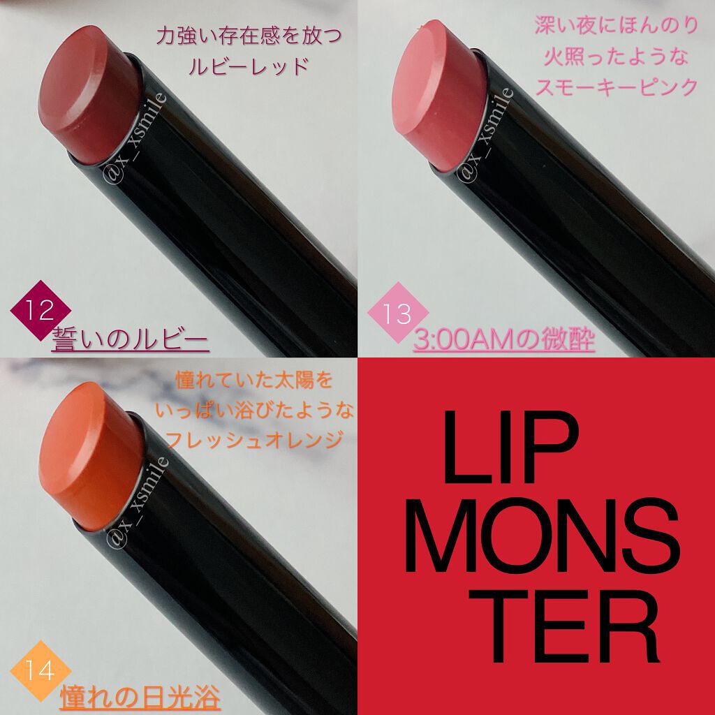 - 落ちにくさも美発色もよくばりたい、つけたての色が長時間持続する人気の口紅リップモンスター。 唇から蒸発する水分を活用して密着ジェル膜に変化する独自技術※で、つけたての色が長時間持続。 高発色&保湿。 ※当社独自の色持ち技術 ■花火のようにまぶしくきらめく 繊細なラメが際立つ限定色 EX-6 ピンクカラー×青ラメ【ロケット花火流星群】 EX-7 オレンジカラー×黄&緑ラメ【100万発の線香花火】 EX-8 レッドカラー×緑ラメ【打ち上げ花火ブランコ】 ■深みレッド系カラーの限定色 EX-9 戦慄の喜笑 (限定色) EX-10 狂気の怒号 (限定色) 【2025クリスマスコフレ】 落ちにくいリップモンスターから、唇の血色感を底上げする ホリデーシーズン限定の熱感ニュアンスベージュ系カラー登場。 EX-11 紅煙宿る贈り物(限定色):ボルドーベージュ系 EX-12 盗まれた1224mの星光(限定色):キャメルベージュ系