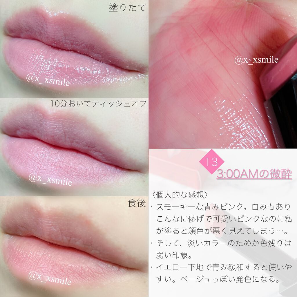 リップモンスターの13を選びましたᝰ✍︎ 13 3:00AMの微酔のカラーは人によっては発色が物足りなく感じそう 発色は想像よりよかったです。自分の唇に色が乗ってくれるかが1番の不安でしたが、2.3回塗ると普通に発色してくれましたᝰ✍︎ 白に映えるピンクという印象を受けたので白の服に合わせてつけたいです🐇🫧