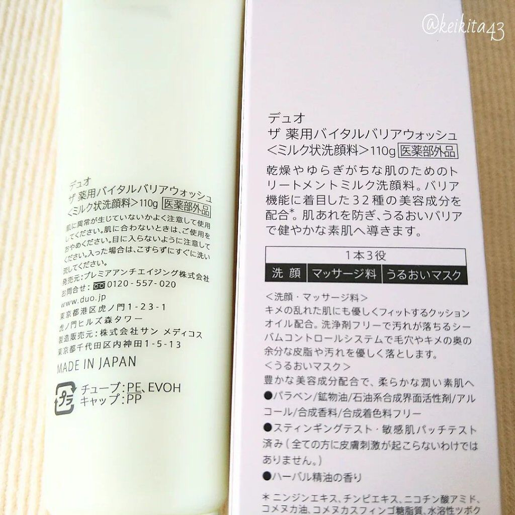 - 乾燥しがちな敏感肌をまろやかに洗う薬用ミルク洗顔料です。 スキンケア仕立てのやさしさで、肌あれのもとをケア※2。 うるおう力を育み、芯からすこやかな肌へと導きます。 ※1 販売名:デュオ ザ 薬用バイタルバリアウォッシュ ※2 有効成分(アラントイン、グリチルリチン酸ジカリウム)とうるおいによる