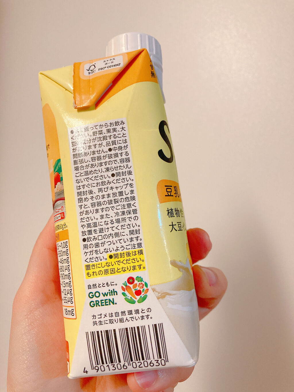 植物性ミルク 甘みのある大豆に完熟したバナナをブレンド マルチビタミン(A、B2、B12、C、E)摂取できる 植物性タンパク質、大豆イソフラボン コレステロール0 砂糖、甘味料無添加 1/2食分の野菜使用 330ml 126kcal 甘さ控えめで豆乳とバナナの味とのバランス良くて美味しい 1本でけっこう飲みごたえあります