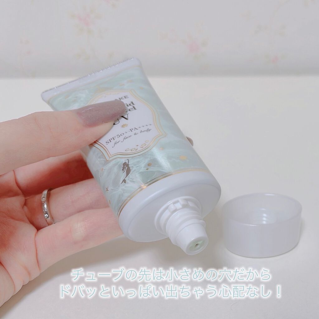 - パシャッと爽快!人魚姫気分♥化粧水感覚で使えるUVジェル 国内最強レベルのUVカット効果で紫外線から肌を守ります。 肌にのばすとパシャッとはじける水感ジェルでみずみずしく軽い仕上がり。 顔だけでなく全身にも使えます。 洗顔後、これ1本でスキンケア・保湿下地・UVカット下地としてご使用いただけます。 ※2~3時間ごとにこまめに塗り直しをしてください。 また、肌をタオル等で拭いた際も塗り直しを推奨いたします。