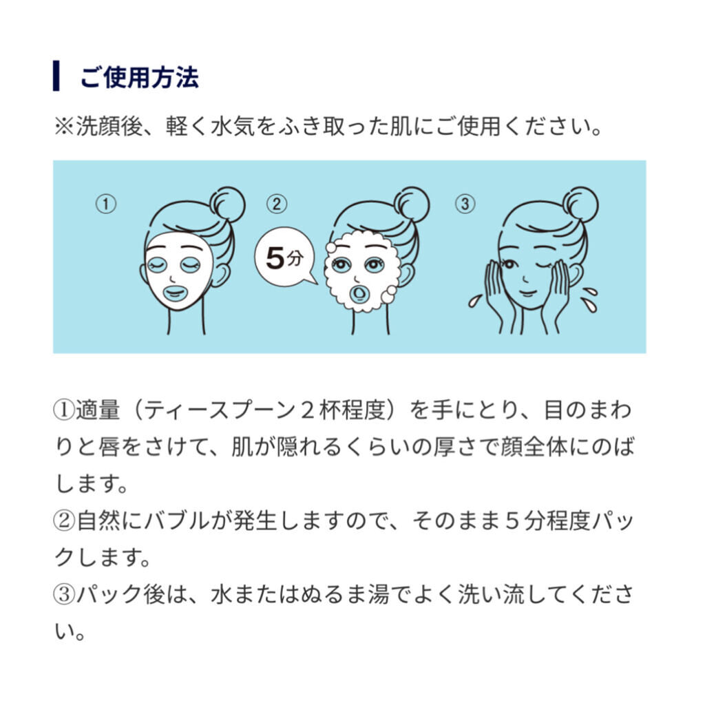 - 肌に塗るとぽこぽこ発砲するフレッシュバブルパックで角質ケア&透明感アップ! 泡の効果で肌をやさしくマッサージしながら、肌に潤いを補ってぷりぷりの桃肌に。乾燥やくすみが気になる時に透明感を引き出すスペシャルケアにおすすめ。 配合成分:ヨーグルトエキス配合 パックの角質ケア効果をサポートしながら肌に潤いを補います。 使用方法 ①洗顔後、軽く水気をふき取った肌にご使用ください。 ②自然にバブルが発生しますので、そのまま5分程度パックします。 ③パック後は水かぬるま湯でよく洗い流します。
