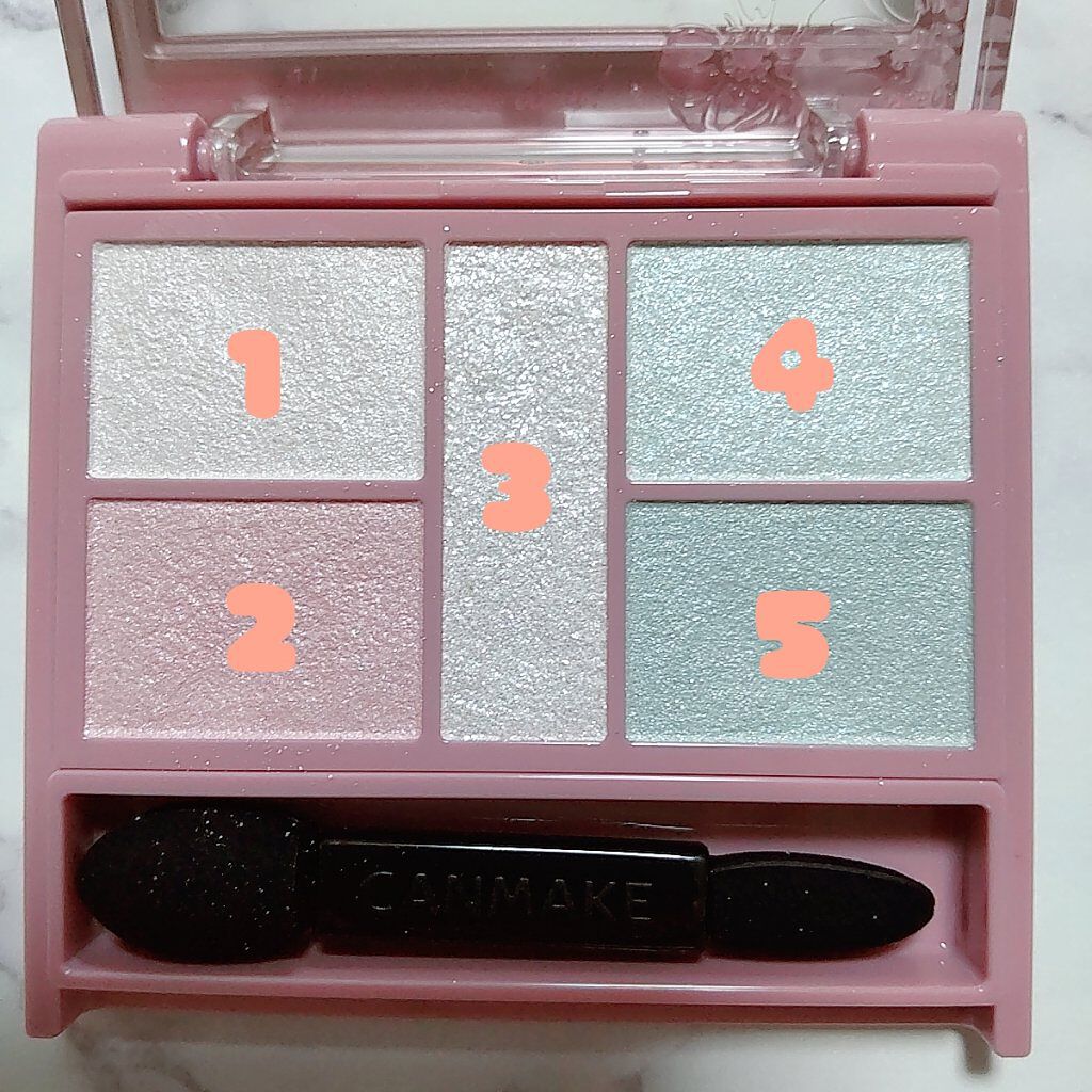 - 1枚のパレットで2つのスタイルが完成! 5色の欲ばりアイシャドウ♥ メインカラーを選んで2つのスタイルが楽しめる! A→B→D でスタイル1 A→C→D でスタイル2 繊細な粉質が、しっとりとまぶたに密着して色落ちを防ぎます。 透明感のあるキラうるトッピングジュエル(繊細ラメ)は、気分によってトッピング!