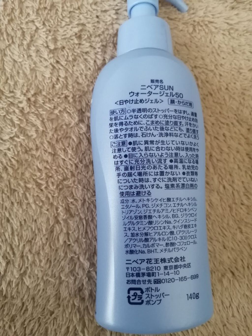 ニベアUVウォータージェル<顔・からだ用>ポンプ 140g ¥1,303〜SPF50/PA+++軽いつけ心地でベタつきにくいウォータリーベース75%のスキンケアUV化粧水と乳液の間くらいのテクスチャー鉱物油フリー・合成香料フリー・合成着色剤フ...