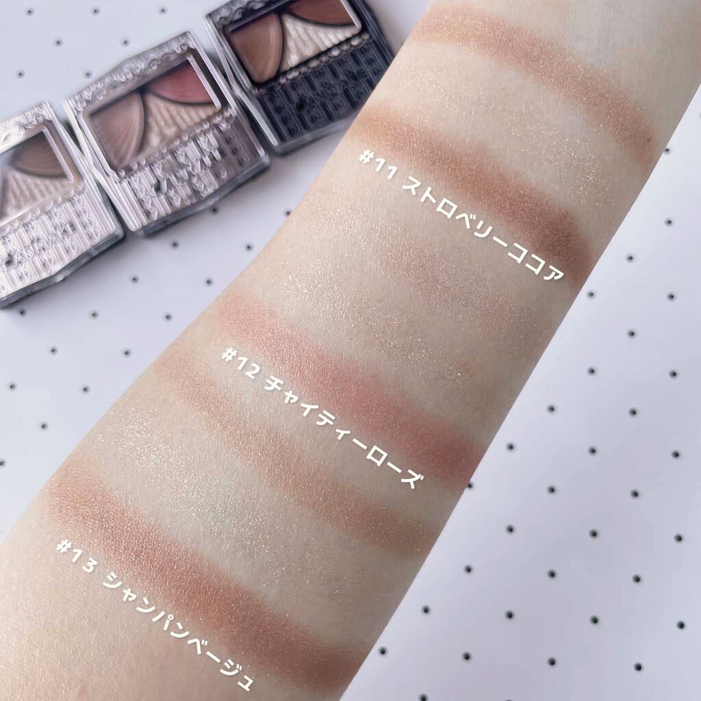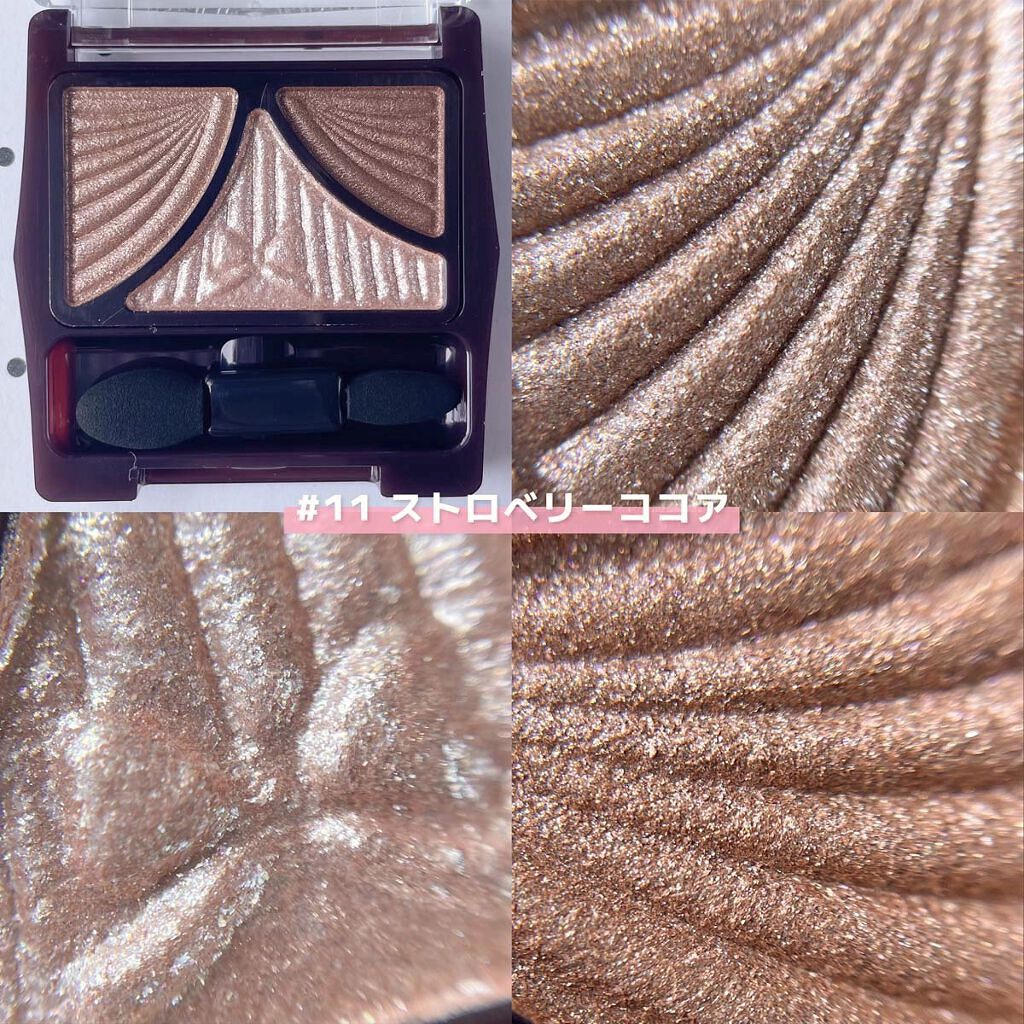 - パウダーなのにみずみずしい♥ 自然な立体感をつくりだす3色アイシャドウパレット 仕上げのコートで、ジューシー感&モチUP! メインカラー&ラインカラーはフィッティングオイル配合のしっとりパウダーで、 まぶたに吸いつくように溶け込み、ジューシーコートスフレで覆うことによって、 濡れたようにツヤめく愛されまぶたで透明感のある目元を演出します。