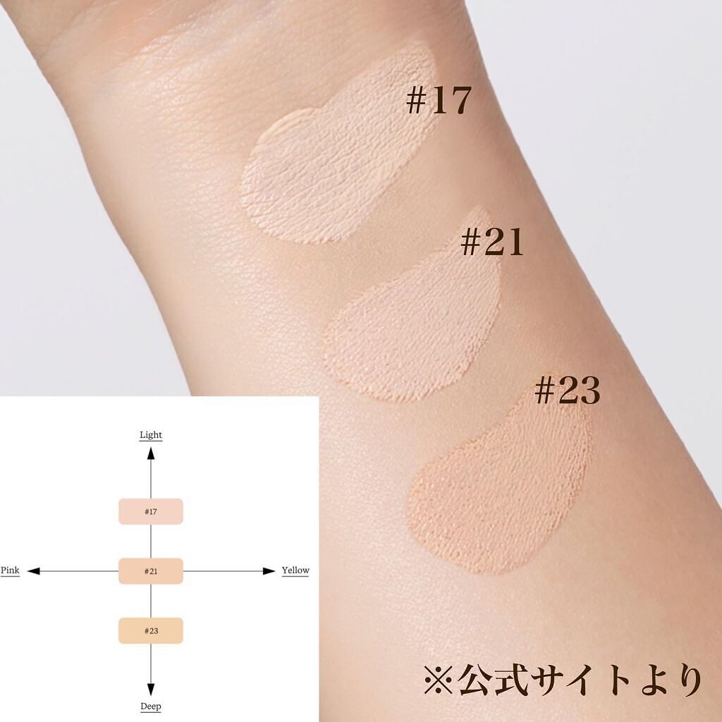 - <17 フェア> 水、酸化チタン、ジメチコン、フェニルトリメチコン、メトキシケイヒ酸エチルヘキシル、DPG、ミリストイルメチルアミノプロピオン酸ヘキシルデシル、プロパンジオール、キャンデリラロウ、ナイアシンアミド、オクトクリレン、ペンチレングリコール、トリエチルヘキサノイン、合成フルオロフロゴパイト、マイクロクリスタリンワックス、ヒアルロン酸、アーモンド油、リンゴ果実エキス、加水分解オクラ種子エキス、ハゴロモグサエキス、ローマカミツレ花エキス、チャ葉エキス、エナンチアクロランタ樹皮エキス、テルミナリアフェルジナンジアナ果実エキス、シロキクラゲエキス、ツボクサエキス、セイヨウナツユキソウエキス、ビフィズス菌培養液、ビフィズス菌培養溶解質、乳酸桿菌培養溶解質、乳酸球菌培養溶解質、メマツヨイグサ花エキス、サッカロミセス培養液、水溶性コラーゲン、スベリヒユエキス、ヒメコウジ葉エキス、ジエチルアミノヒドロキシベンゾイル安息香酸ヘキシル、ダイマージリノール酸(フィトステリル/イソステアリル/セチル/ステアリル/ベヘニル)、(ジメチコン/(PEG-10/15))クロスポリマー、アルミナ、セチルPEG/PPG-10/1ジメチコン、塩化Na、イソステアリン酸ソルビタン、ポリヒドロキシステアリン酸、トリエトキシカプリリルシラン、ステアリン酸、カプリリルグリコール、ジステアルジモニウムヘクトライト、カプリル酸グリセリル、水酸化Al、パルミチン酸エチルヘキシル、ミリスチン酸イソプロピル、イソステアリン酸、レシチン、ポリリシノレイン酸ポリグリセリル-3、アデノシン、エチレンジアミンジコハク酸3Na、クエン酸Na、トコフェロール、BG、グリセリン、4-テルピネオール、セラミドNP、デキストリン、マルトデキストリン、糖水解物、1,2-ヘキサンジオール、水添レシチン、ステアリン酸ポリグリセリル-10、パンテノール、アスコルビルリン酸Na、酢酸トコフェロール、エチルヘキシルグリセリン、アラキドン酸グリセリル、リノレン酸グリセリル、オレアノール酸、ビオチン、パルミチン酸レチノール、BHT、香料、酸化鉄 <21 ナチュラルベージュ> 水、酸化チタン、ジメチコン、フェニルトリメチコン、メトキシケイヒ酸エチルヘキシル、DPG、ミリストイルメチルアミノプロピオン酸ヘキシルデシル、プロパンジオール、キャンデリラロウ、ナイアシンアミド、オクトクリレン、ペンチレングリコール、トリエチルヘキサノイン、合成フルオロフロゴパイト、マイクロクリスタリンワックス、ヒアルロン酸、アーモンド油、リンゴ果実エキス、加水分解オクラ種子エキス、ハゴロモグサエキス、ローマカミツレ花エキス、チャ葉エキス、エナンチアクロランタ樹皮エキス、テルミナリアフェルジナンジアナ果実エキス、シロキクラゲエキス、ツボクサエキス、セイヨウナツユキソウエキス、ビフィズス菌培養液、ビフィズス菌培養溶解質、乳酸桿菌培養溶解質、乳酸球菌培養溶解質、メマツヨイグサ花エキス、サッカロミセス培養液、水溶性コラーゲン、スベリヒユエキス、ヒメコウジ葉エキス、ジエチルアミノヒドロキシベンゾイル安息香酸ヘキシル、ダイマージリノール酸(フィトステリル/イソステアリル/セチル/ステアリル/ベヘニル)、(ジメチコン/(PEG-10/15))クロスポリマー、アルミナ、セチルPEG/PPG-10/1ジメチコン、塩化Na、イソステアリン酸ソルビタン、ポリヒドロキシステアリン酸、トリエトキシカプリリルシラン、ステアリン酸、カプリリルグリコール、ジステアルジモニウムヘクトライト、カプリル酸グリセリル、水酸化Al、パルミチン酸エチルヘキシル、ミリスチン酸イソプロピル、イソステアリン酸、レシチン、ポリリシノレイン酸ポリグリセリル-3、アデノシン、エチレンジアミンジコハク酸3Na、クエン酸Na、トコフェロール、BG、グリセリン、4-テルピネオール、セラミドNP、デキストリン、マルトデキストリン、糖水解物、1,2-ヘキサンジオール、水添レシチン、ステアリン酸ポリグリセリル-10、パンテノール、アスコルビルリン酸Na、酢酸トコフェロール、エチルヘキシルグリセリン、アラキドン酸グリセリル、リノレン酸グリセリル、オレアノール酸、ビオチン、パルミチン酸レチノール、BHT、香料、酸化鉄 <23 サンド> 水、酸化チタン、ジメチコン、フェニルトリメチコン、メトキシケイヒ酸エチルヘキシル、DPG、ミリストイルメチルアミノプロピオン酸ヘキシルデシル、プロパンジオール、キャンデリラロウ、ナイアシンアミド、オクトクリレン、ペンチレングリコール、トリエチルヘキサノイン、合成フルオロフロゴパイト、マイクロクリスタリンワックス、ヒアルロン酸、アーモンド油、リンゴ果実エキス、加水分解オクラ種子エキス、ハゴロモグサエキス、ローマカミツレ花エキス、チャ葉エキス、エナンチアクロランタ樹皮エキス、テルミナリアフェルジナンジアナ果実エキス、シロキクラゲエキス、ツボクサエキス、セイヨウナツユキソウ