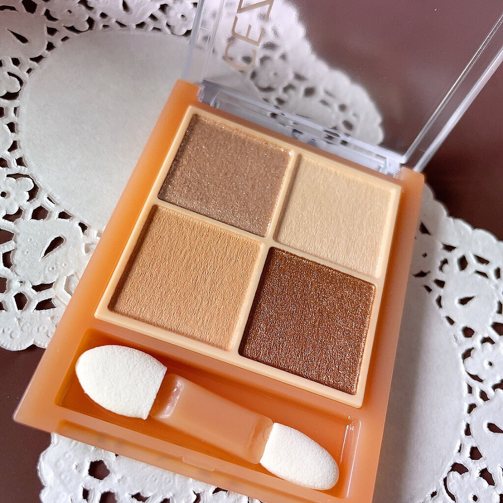 - ラメ・パール・マット3質感の4色アイシャドウ。 肌馴染みの良いベージュを基調としたカラー。ラメ・パール・マットの3質感を重ねて、自然にまぶたを強調し奥行のある大きな目元へ。 しっとり溶け込むような柔らかなパウダーなので、スルスル伸びてまぶたにピタッと密着。保湿成分(スクワラン・ホホバ種子油)配合。