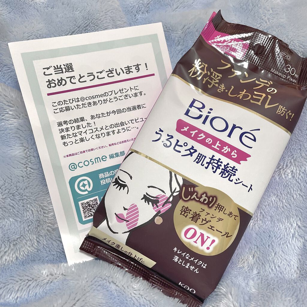 ビオレ様より商品提供していだたきました。Bioreメイクの上からうるピタ肌持続シート10枚入試供品試供品なので10枚入ですがコスパ良さげ◎《特徴》ファンデの粉浮き・しわヨレ防ぐ朝のメイクを密着ロック*¹!*¹うるピタ肌続く:シートによるメイク...