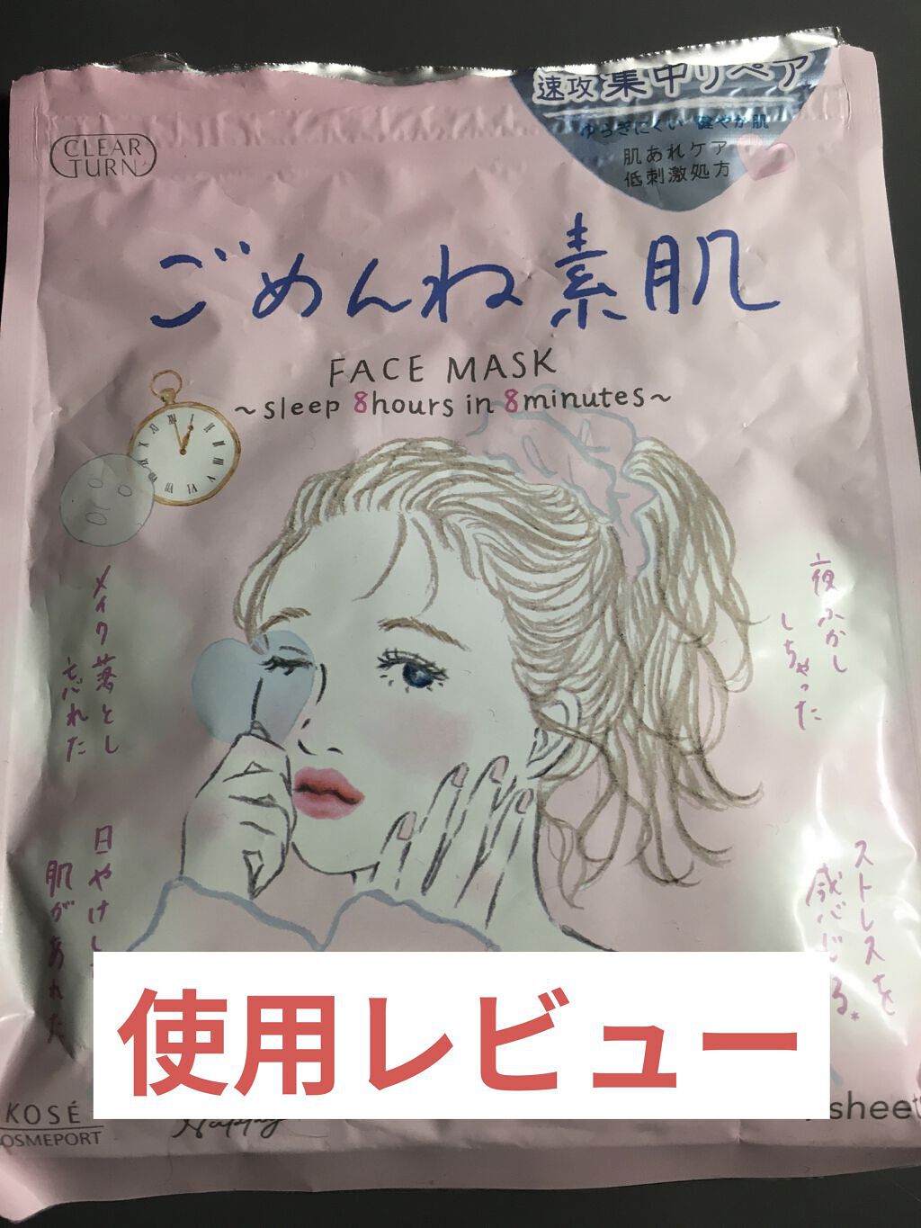 - 【クリアターン ごめんね素肌マスク】 負担をかけて、あれてしまった肌の素肌環境※1をととのえる“速攻集中リペア※2マスク”です。 ① あれがちな肌を素早くコンディションケア! ザクロエキス、桜エキス※3、ウメ果実エキスBG配合し、ゆらぎやすい肌環境をととのえ、肌あれをケアします。また、うるおいケア成分として、ヒアルロン酸、白キクラゲ多糖体BGを配合。外的ストレス※4や不規則な生活の影響を受けやすい肌も健やかでゆらぎにくい肌へみちびきます。 ②敏感肌も使える、弱酸性・低刺激処方 無香料・無着色・無鉱物油・アルコールフリー(エチルアルコール)・パラベンフリー・紫外線吸収剤フリー・シリコーンフリー・パッチテスト済み・アレルギーテスト済み・スティンギングテスト済み・敏感肌自覚者による連用テスト済み(すべての方にアレルギーや皮膚刺激が起きない、刺激感がないというわけではありません。すべての方の肌に合うということではありません。) ③角質ケアもできる!凸凹高密着シート コットン生まれのやわらかな肌触りのベンリーゼを使用。 表面に凸凹のエンボス加工を施しているため、密着性が高く、はがしたマスクでやさしく顔をふきとることで角質ケアもできます。 ※1 うるおい環境のこと ※2 うるおいお手入れのこと ※3 ソメイヨシノ葉エキス、ウメ果実エキスBGはウメ果実エキス・BG(保湿) ※4 乾燥による刺激のこと