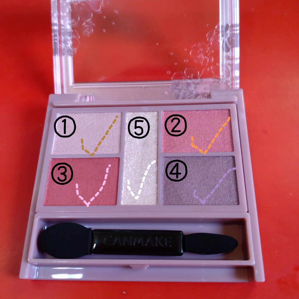 - 1枚のパレットで2つのスタイルが完成! 5色の欲ばりアイシャドウ♥ メインカラーを選んで2つのスタイルが楽しめる! A→B→D でスタイル1 A→C→D でスタイル2 繊細な粉質が、しっとりとまぶたに密着して色落ちを防ぎます。 透明感のあるキラうるトッピングジュエル(繊細ラメ)は、気分によってトッピング!