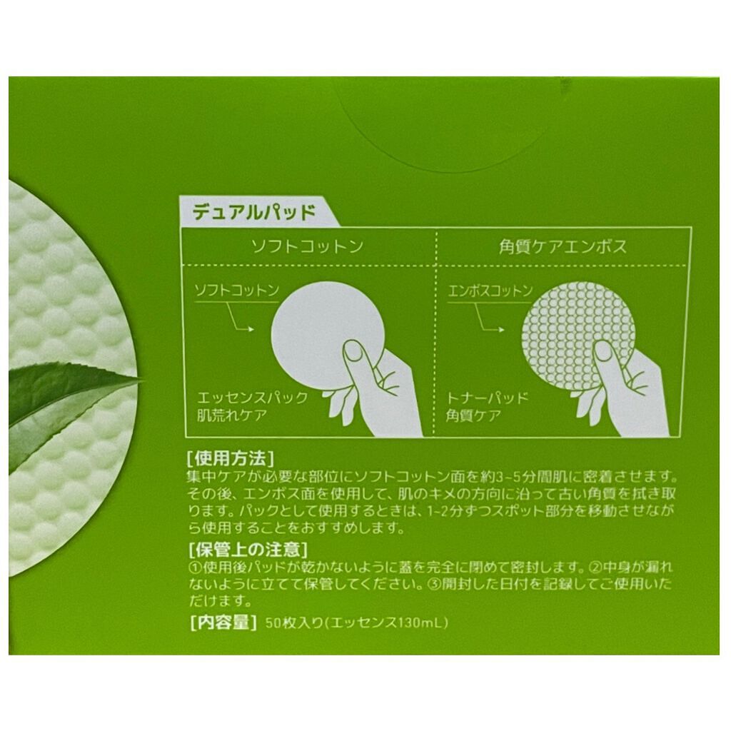 - 肌荒れを予防するティーツリーエッセンス(ティーツリー葉水、ティーツリー葉エキス、ティーツリー葉油の3種類を整肌成分として)を、コットン100%の肌に優しい使い心地のパッドに贅沢にたっぷり配合しております。 片面はエンボスコットン、もう片面がソフトコットンになった「デュアルパッド」になっており、用途に応じての使い分けが可能です。エンボスコットンの面は、手軽に角質・毛穴汚れをオフできる拭き取り化粧水としてお使いいただけます。ソフトコットンの面は、乾燥が気になる部分、肌荒れ予防や集中ケアしたい部分のポイントパックとしてお使いいただけます。 ※2022年9月以降パッケージリニューアル。
