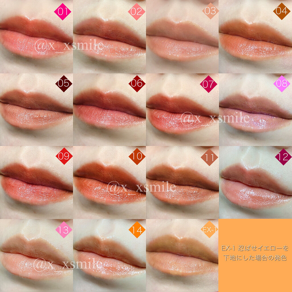 毎日その日のメイクや気分でカラーを選んでいます。 使用頻度が多いのはやっぱり02 Pink bananaで1番多くてお気に入り🍌💕 青みにも黄みにも寄らないまろやかなピンクベージュが使いやすいです🥺 赤系のカラーでお気に入りは07 ラスボス🌹 ピンクみもあり使いやすいレッド。 オレンジ系のメイクの日は03 陽炎+EX-1 忍ばせイエローを合わせることが多いです☀️ 新色の14 憧れの日光浴もこれからオレンジメイクの日は出番が増えそう☃️🏖☀️ 逆に1番出番が少ないのは10 地底探索😂 レンガブラウンはやっぱりブルベ夏には厳しいです🧱 ブラウン系のカラーの中では11 5:00AMがベージュ寄りで好きですね☺️