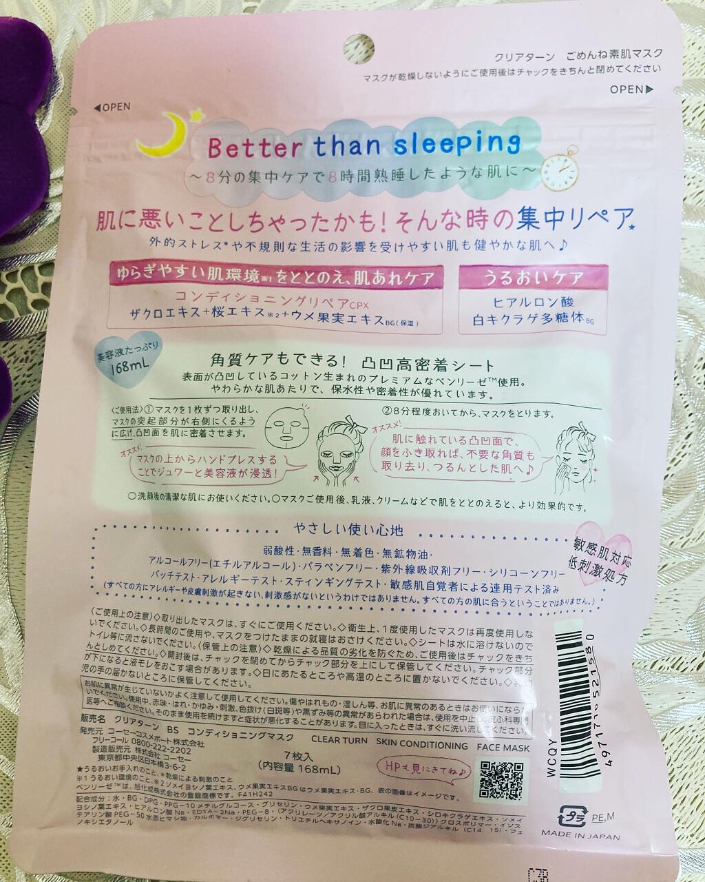 - 【クリアターン ごめんね素肌マスク】 負担をかけて、あれてしまった肌の素肌環境※1をととのえる“速攻集中リペア※2マスク”です。 ① あれがちな肌を素早くコンディションケア! ザクロエキス、桜エキス※3、ウメ果実エキスBG配合し、ゆらぎやすい肌環境をととのえ、肌あれをケアします。また、うるおいケア成分として、ヒアルロン酸、白キクラゲ多糖体BGを配合。外的ストレス※4や不規則な生活の影響を受けやすい肌も健やかでゆらぎにくい肌へみちびきます。 ②敏感肌も使える、弱酸性・低刺激処方 無香料・無着色・無鉱物油・アルコールフリー(エチルアルコール)・パラベンフリー・紫外線吸収剤フリー・シリコーンフリー・パッチテスト済み・アレルギーテスト済み・スティンギングテスト済み・敏感肌自覚者による連用テスト済み(すべての方にアレルギーや皮膚刺激が起きない、刺激感がないというわけではありません。すべての方の肌に合うということではありません。) ③角質ケアもできる!凸凹高密着シート コットン生まれのやわらかな肌触りのベンリーゼを使用。 表面に凸凹のエンボス加工を施しているため、密着性が高く、はがしたマスクでやさしく顔をふきとることで角質ケアもできます。 ※1 うるおい環境のこと ※2 うるおいお手入れのこと ※3 ソメイヨシノ葉エキス、ウメ果実エキスBGはウメ果実エキス・BG(保湿) ※4 乾燥による刺激のこと