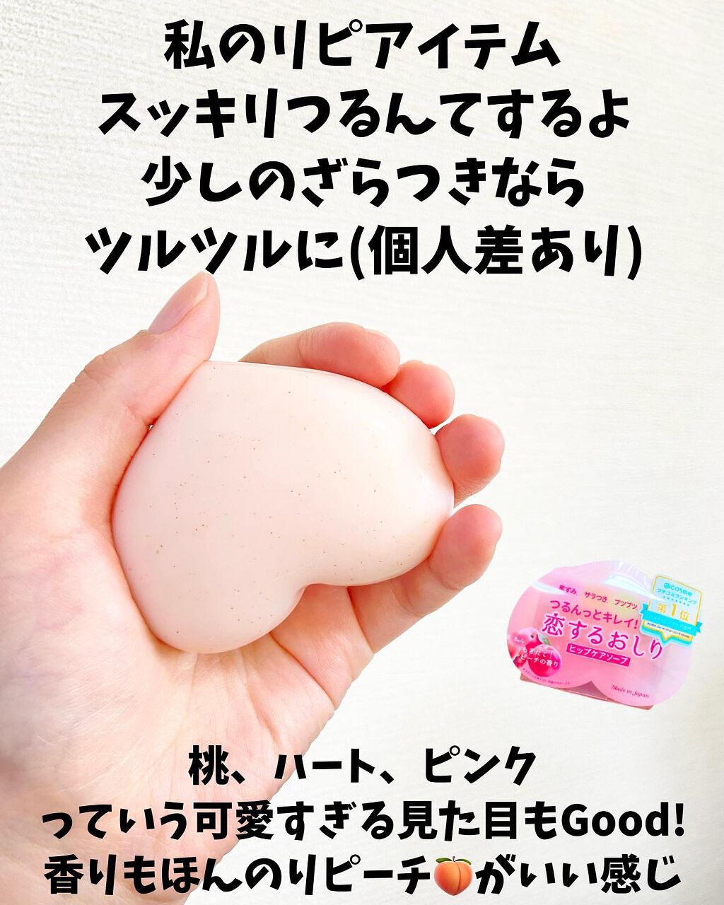 - 恋するおしり ヒップケアソープ おしりの黒ずみ・ザラつき・ブツブツにくるくる直接洗いの簡単ケア! (1)余分な古い角質を落とす:角質ケア スクラブ※1&ピーリング成分※2配合 【モモ核、マンナン※1 グルコノバクター/ハチミツ発酵液、 リンゴ酸・乳酸・クエン酸※2】 (2)必要なうるおいを守る:保湿ケア 6種※3の美容保湿エッセンスを配合 【モモ葉エキス、モモ種子エキス、ビワ葉エキス、キウイエキス、 アーチチョーク葉エキス、アロエベラ液汁※3】 ◎「きゅんっ」とする もぎたて!ピーチの香り