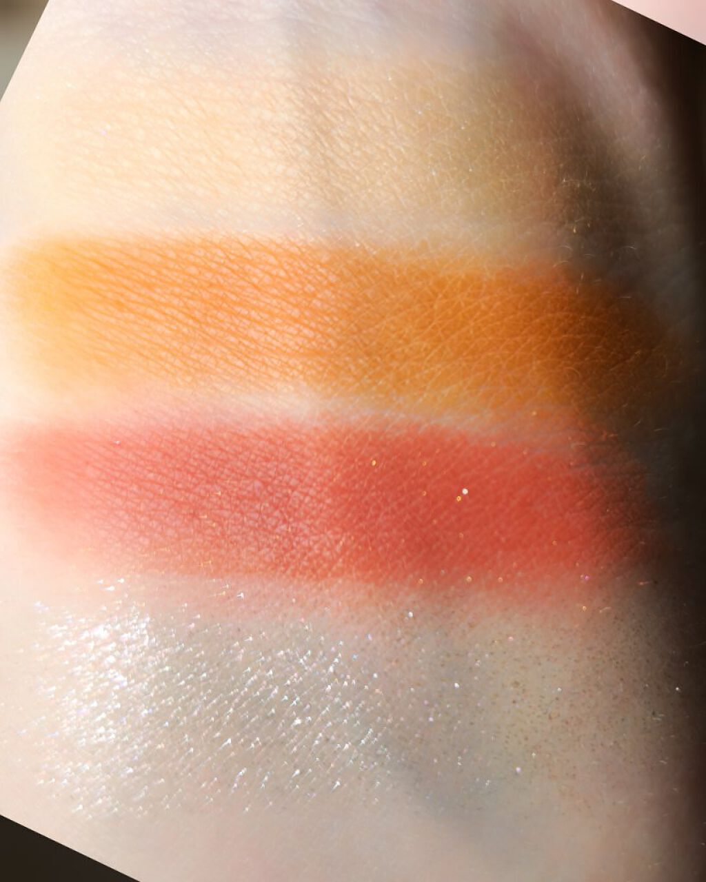 チークなんてマスクしてるからしてなかったんだけど、はずす機会も増えたので✨ 決めきれなくて全色(;^ω^) 普段使いにはベージュコーラル肌に馴染んでつやつやホッペに✨コーラルなんですが若干オレンジも デートな気分の時はゴールドピーチゴールドパールがツヤキラふんわり可愛いピンクです✨ 大人な落ち着きたいメイクの時はシナモンオレンジ落ち着いたシナモンで儚いメイクにも💡 ブラシが使いやすくてよかったです( *´•ω•`*)ノシ
