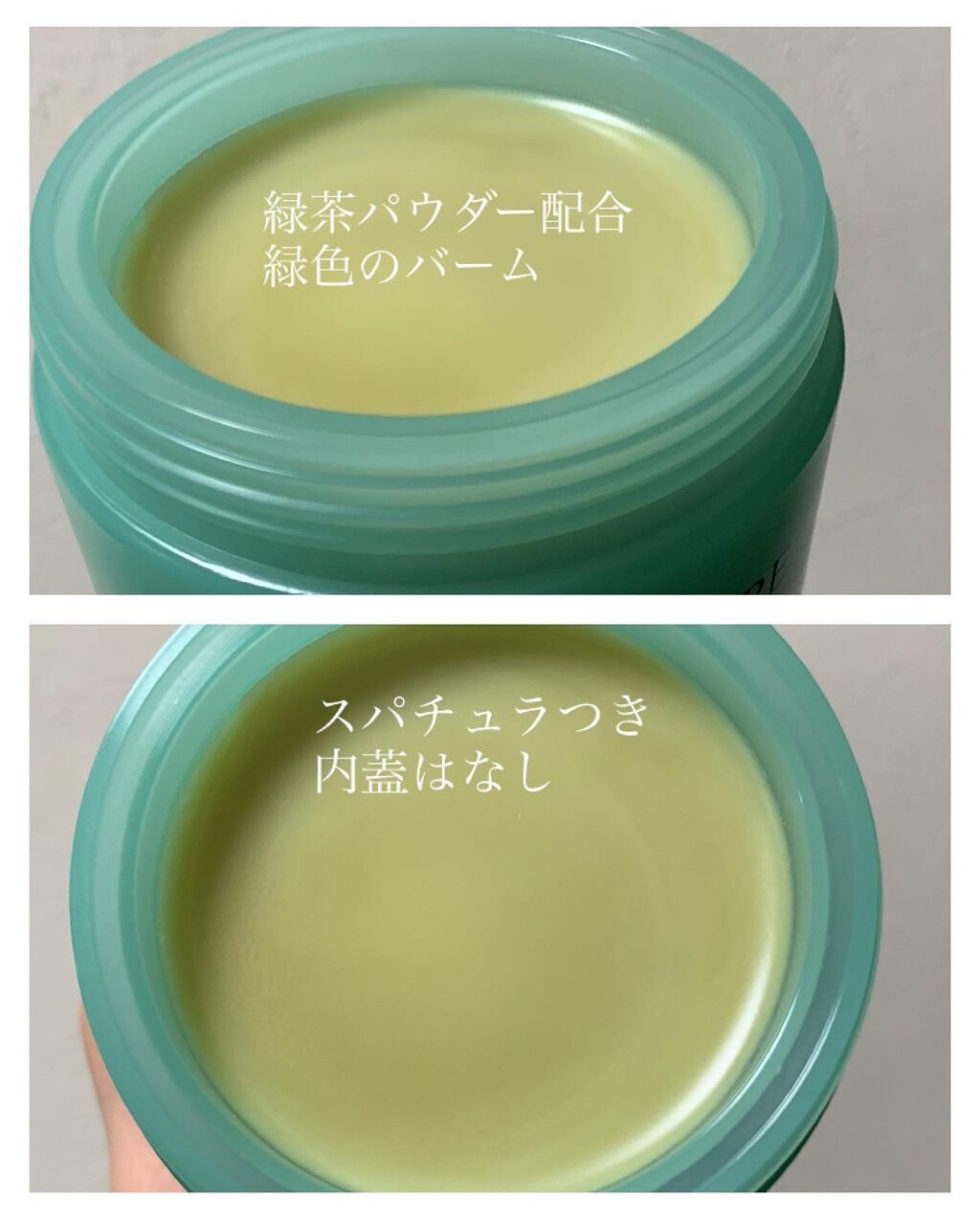 - 緑茶パウダー*とオイルバームテキスチャーが肌に刺激の少ない使い心地でしっかりクレンジング効果を与えてくれます。 *整肌成分