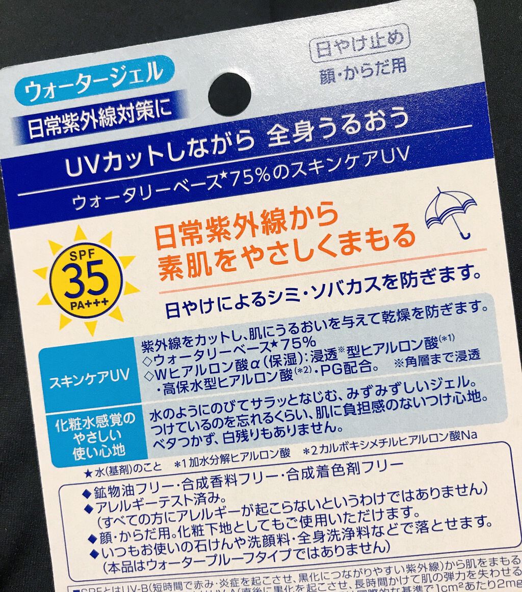 - ◆素肌スキンケアUVジェル。UVカット+全身うるおう(SPF35/PA+++)。肌にうるおいを与えて乾燥を防ぎます。ウォータリーベース*75%のスキンケアUV ◆水のようにのびてサラッとなじむ、みずみずしいジェル。肌に負担感のないつけ心地 ◆いつもお使いの石けんや洗浄料で落とせます。顔・からだ用。化粧下地にも使えます。鉱物油フリー・合成香料フリー・合成着色剤フリー。*水(基剤)のこと