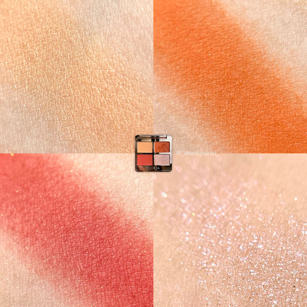 - 優雅、敏感、活発、熱情, 魅力溢れる猫をコンセプトにしたアイシャドウ。 目元際立つ!質感MIXパレット。グリッター、シアー、マット、マット+ラメ。 異なる質感を組み合われば、簡単に存在感のある目元が完成♡その奥深い目元から、誰も目が離せない。 見たままに発色するから、思い通りに色づく目元を気分やファッションに合わせて楽しんで♡ ・手頃なサイズ で品の良さとモードを兼ね備えた新しいアイシャドウパレットです。 ・4色レイヤードでも色ムラになりにくく、ぴたっと密着する薄膜感。 ・粉体を滑らかに広げる技術を採用し、ラメやパール落ちを防ぐのはもちろん、肌との境界も厚みも感じさせにくい、高純度な色の薄膜が実現。大人の目元を清らかに彩るための、洗練された色と透明感を追求。 ・ふんだんに配合したクリアパールで、濃色でも透き通るような抜け感。加えて、乱反射するパールを用いて、より生命感のある光沢に。 ・粉感を感じやすいマット質感の色には、雪のようにふわっと空気を含んだような球状のスノーパウダーを採用。パウダーレスな質感が、なめらかに肌と一体化します。