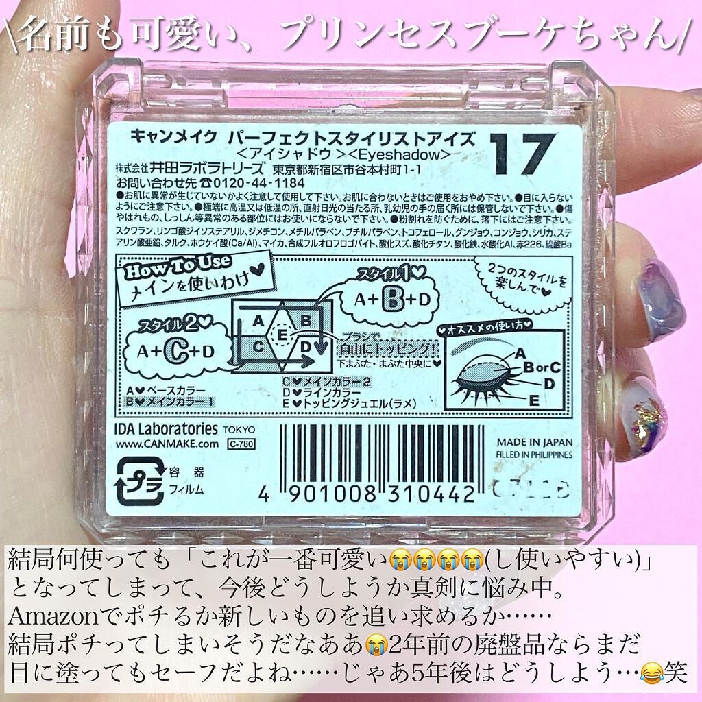 ✨キャンメイク パーフェクトスタイリストアイズ 17プリンセスブーケ 780円✨めっっちゃ前に投稿したんですけどメイクの腕も上がったことだし再投稿~一気に女の子らしい目元に💐このカラー配色はもうかわいくなるのまったなし…🙄どうあがいてもかわい...