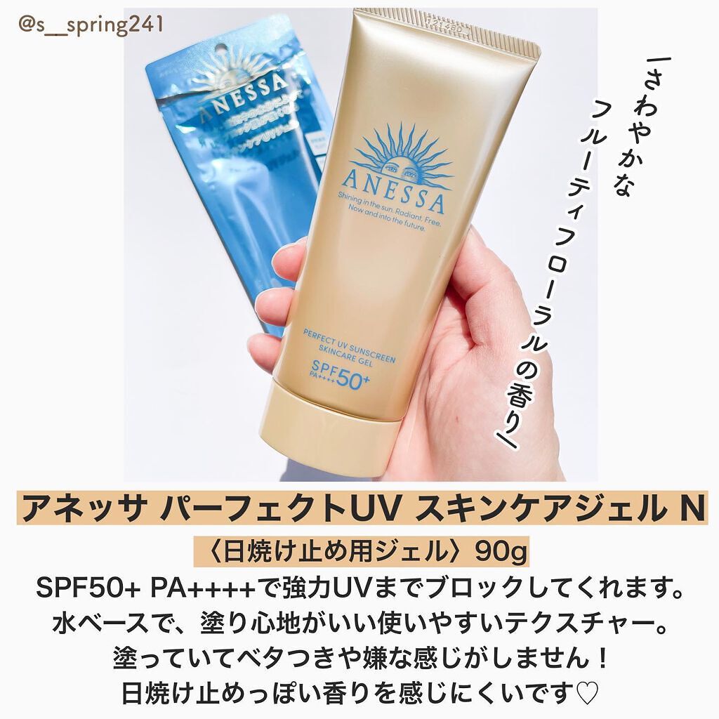 アネッサパーフェクトUV スキンケアジェル NA90gアネッサのこの日焼け止めはリニューアル前も含めて3本目の購入です❣️身体用で使っています!SPF50+PA++++の日焼け止めっていろいろなところから販売されていると思いますがやっぱりアネ...
