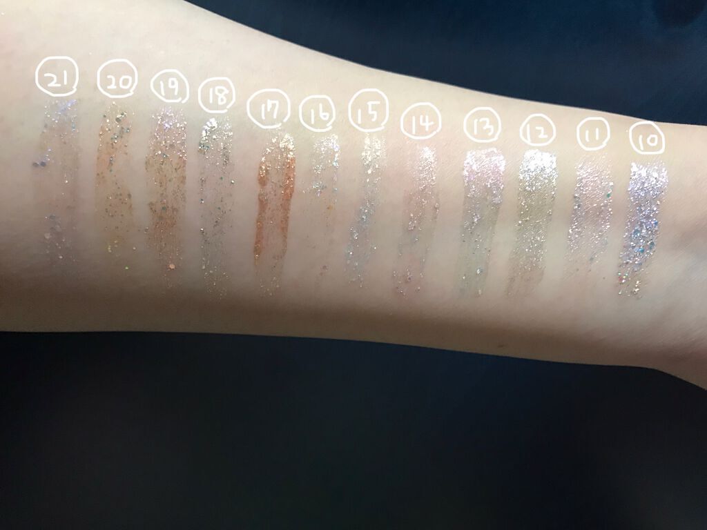 これまで通りマットは既存のものと同様チークのようなサラサラとした密着感のある質感で、ラメも密着度の良い質感です。 ただ既存のものよりも07の右上にある大粒のラメが既存のものよりもとても柔らかい印象でした。かなり崩れやすいので力を入れて触らないように気をつけるよう注意です。 どれも発色がいいので塗る際に調節しながら塗ることをおすすめします。これからの夏に大活躍しそうなパレットです。